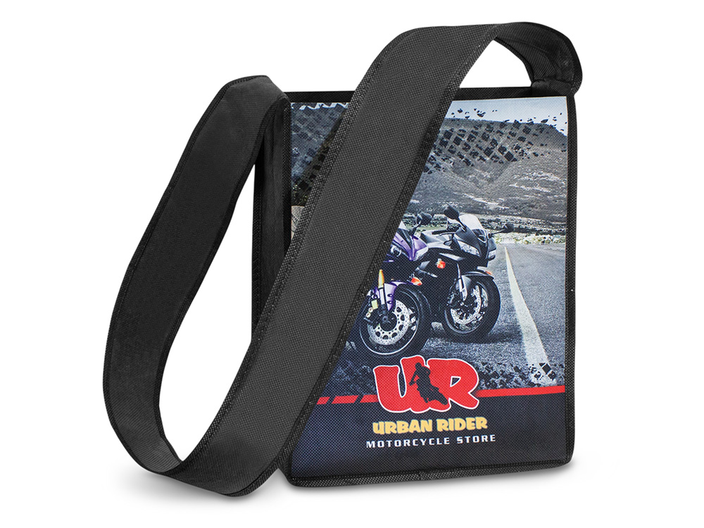 Удобная наплечная сумка-мессенджер с большой вместительностью. Подойдёт как альтернатива классических портфелей для выездных совещаний и других мероприятий. Донная складка позволяет разместить в необходимые документов или другие вещи, при этом позволяя компактно хранить сумку в сложенном виде. Брендирование производится полноцветной печатью в край с обеих сторон. На поверхности сумки можно разместить лого компании или выставки, а также полноразмерный принт любой сложности.