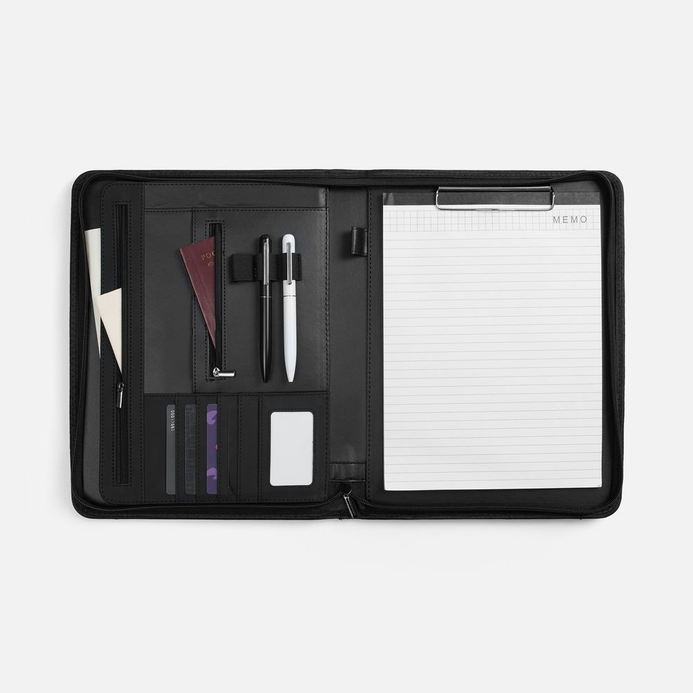 Во вместительной папке предусмотрено множество отделений для визиток, бумаг и письменных принадлежностей — для идеальной организации пространства. Особое преимущество — встроенный блокнот с листами в линейку, который можно легко открепить и положить на его место свои записи, например, для презентаций.