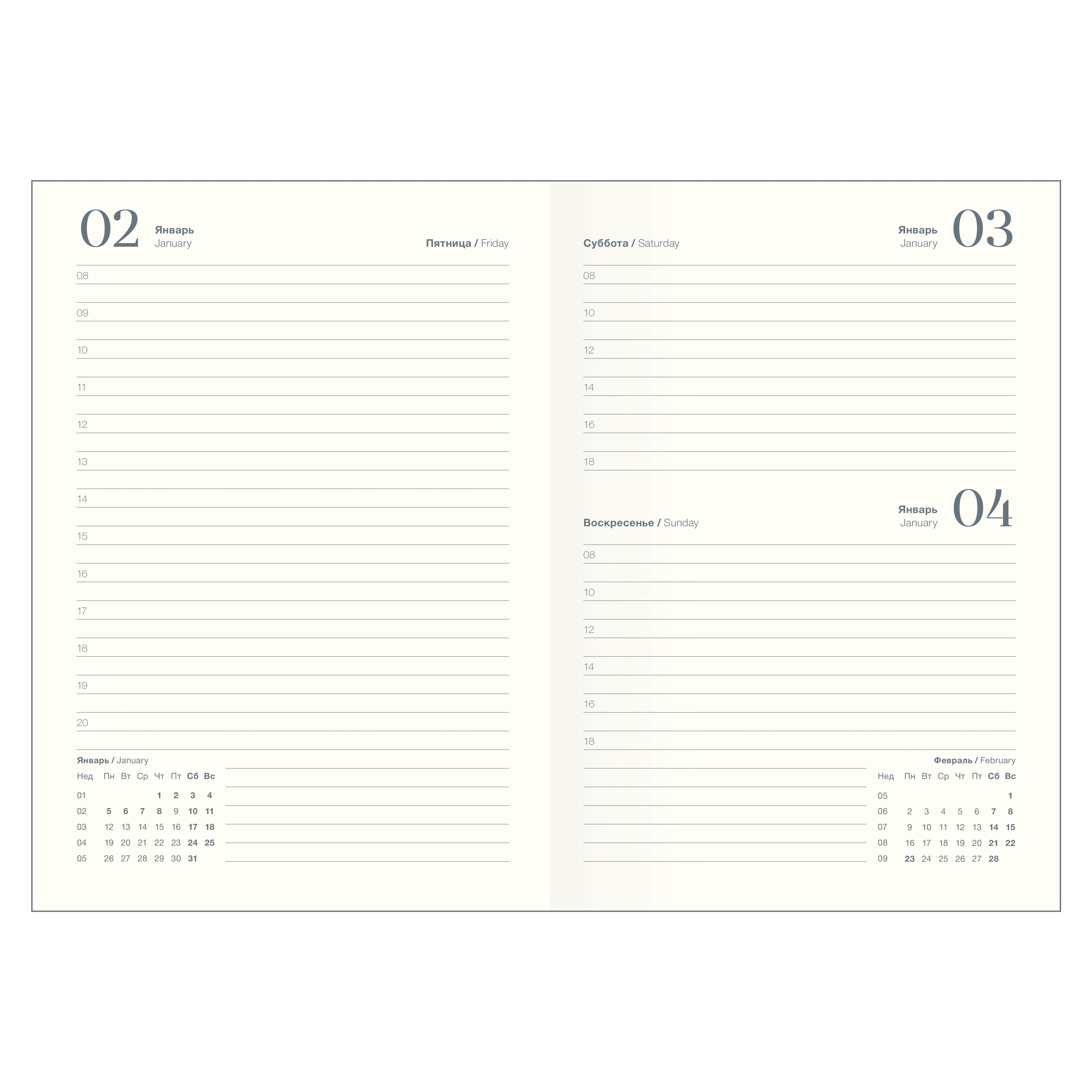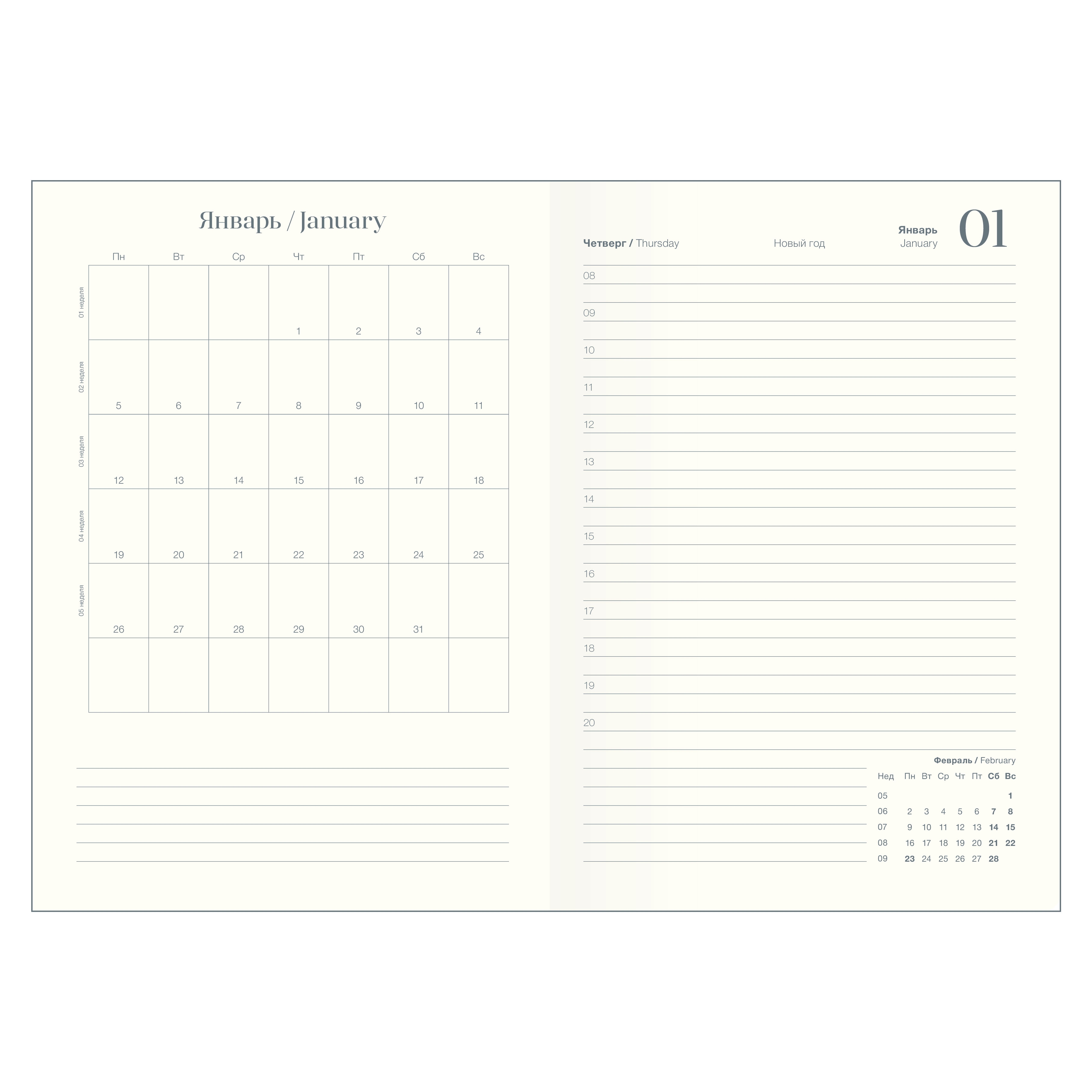 Датированный внутренний блок в линейку на 176 листов (352 страницы) - из высококачественной бумаги цвета слоновой кости плотностью 70 г/м2 и окрашенным обрезом. Информационный блок ежедневника включает в себя: титульный лист, календари на 2026-2027 гг, раздел "планы на год", развороты для заметок в начале и конце блока, планнер перед каждым месяцем.