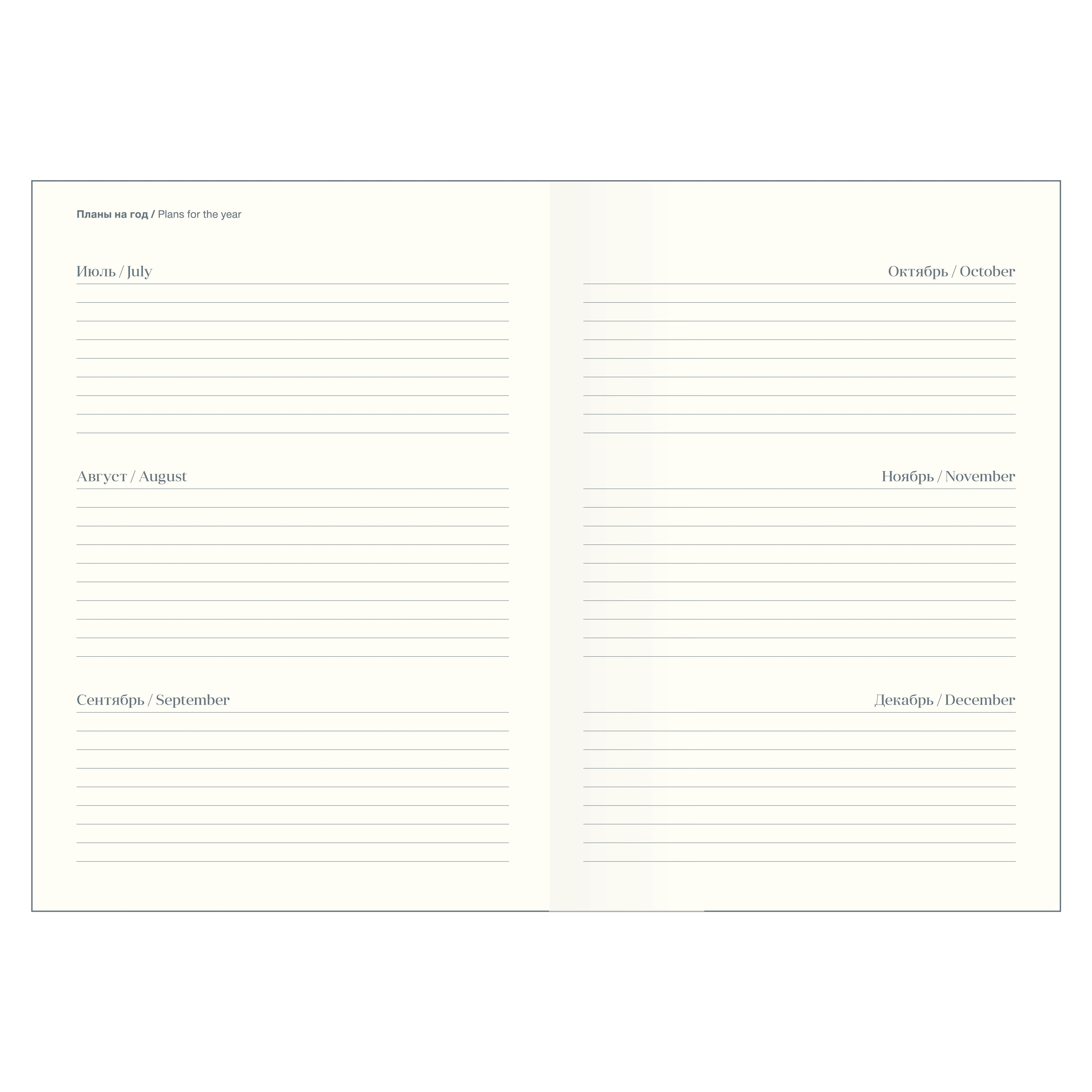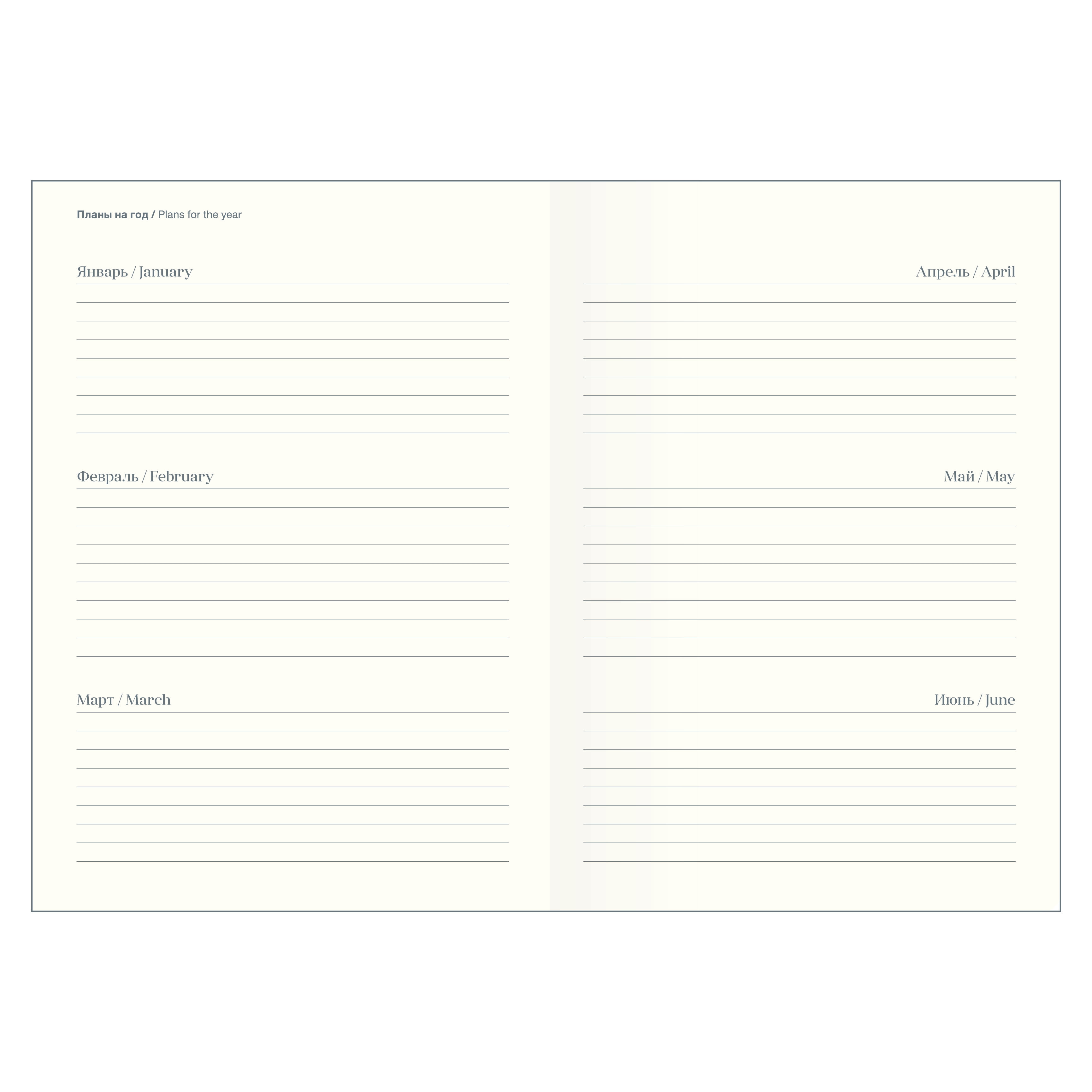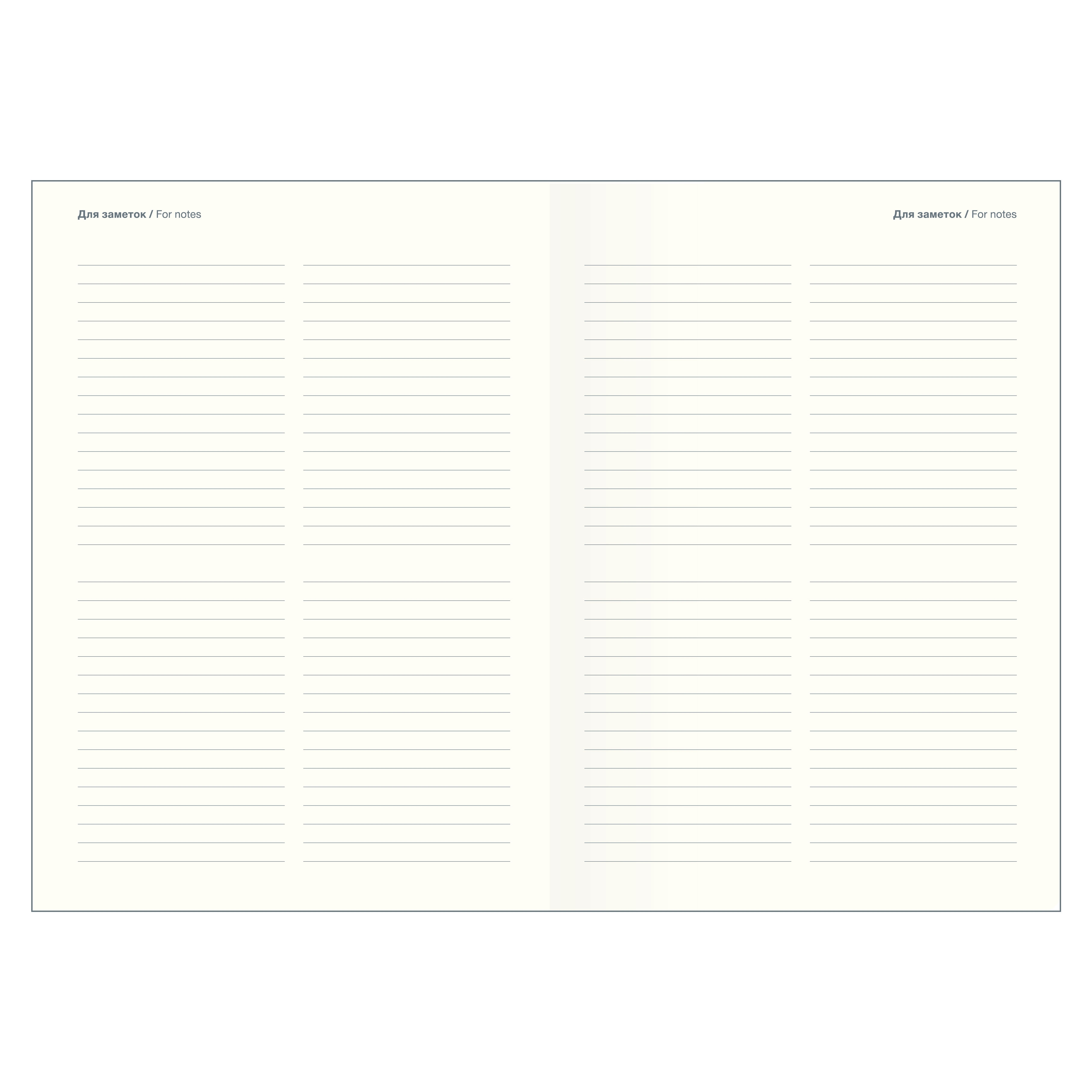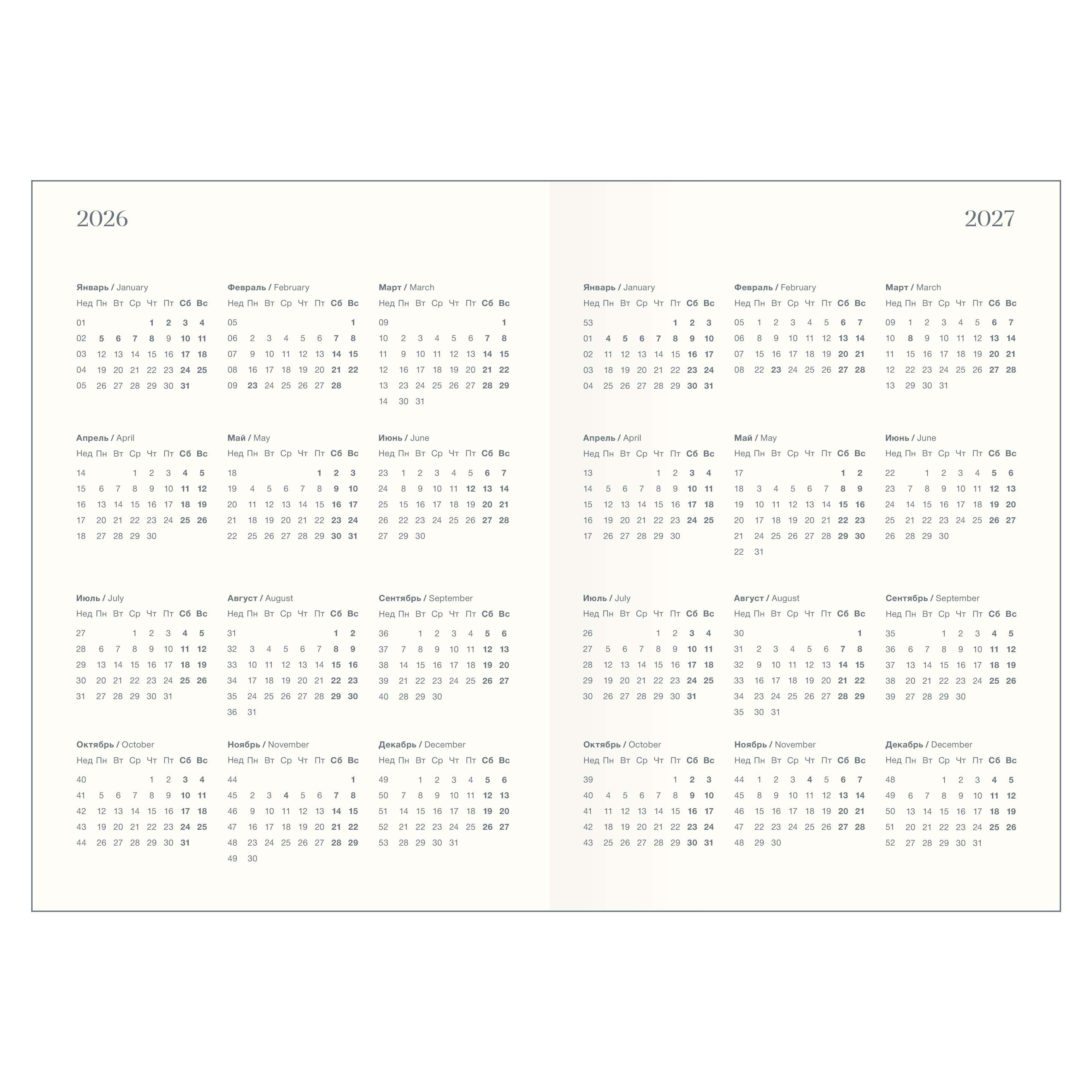 Датированный внутренний блок в линейку на 176 листов (352 страницы) - из высококачественной бумаги цвета слоновой кости плотностью 70 г/м2 и окрашенным обрезом. Информационный блок ежедневника включает в себя: титульный лист, календари на 2026-2027 гг, раздел "планы на год", развороты для заметок в начале и конце блока, планнер перед каждым месяцем.