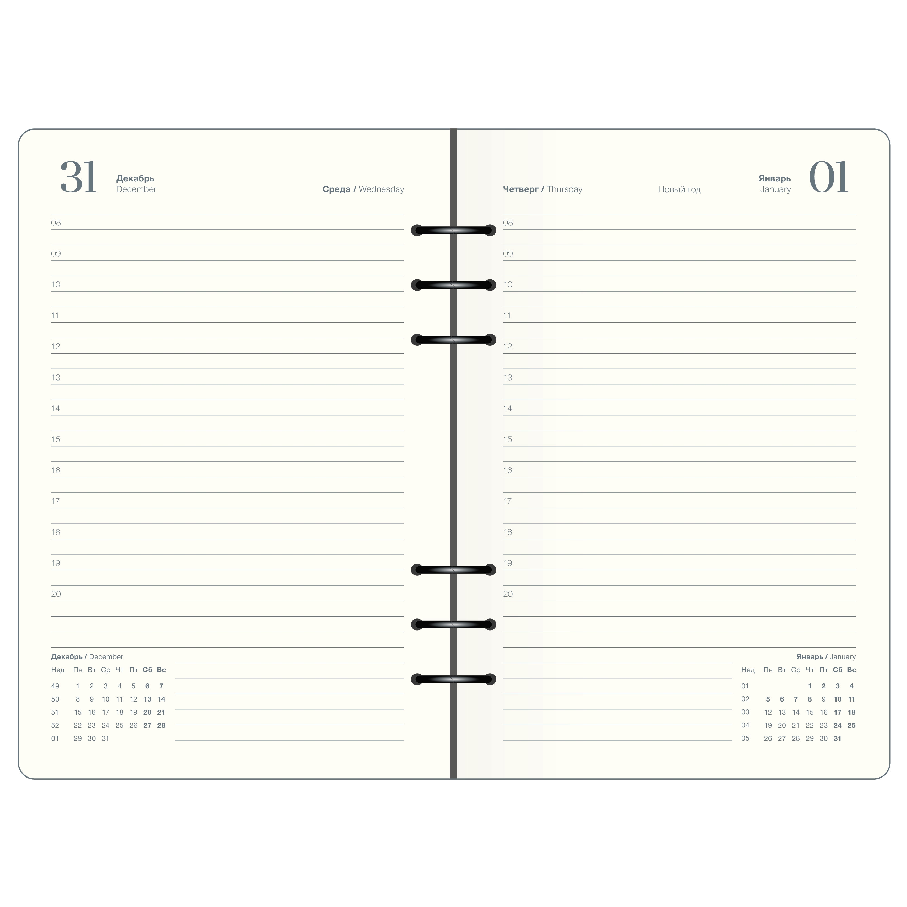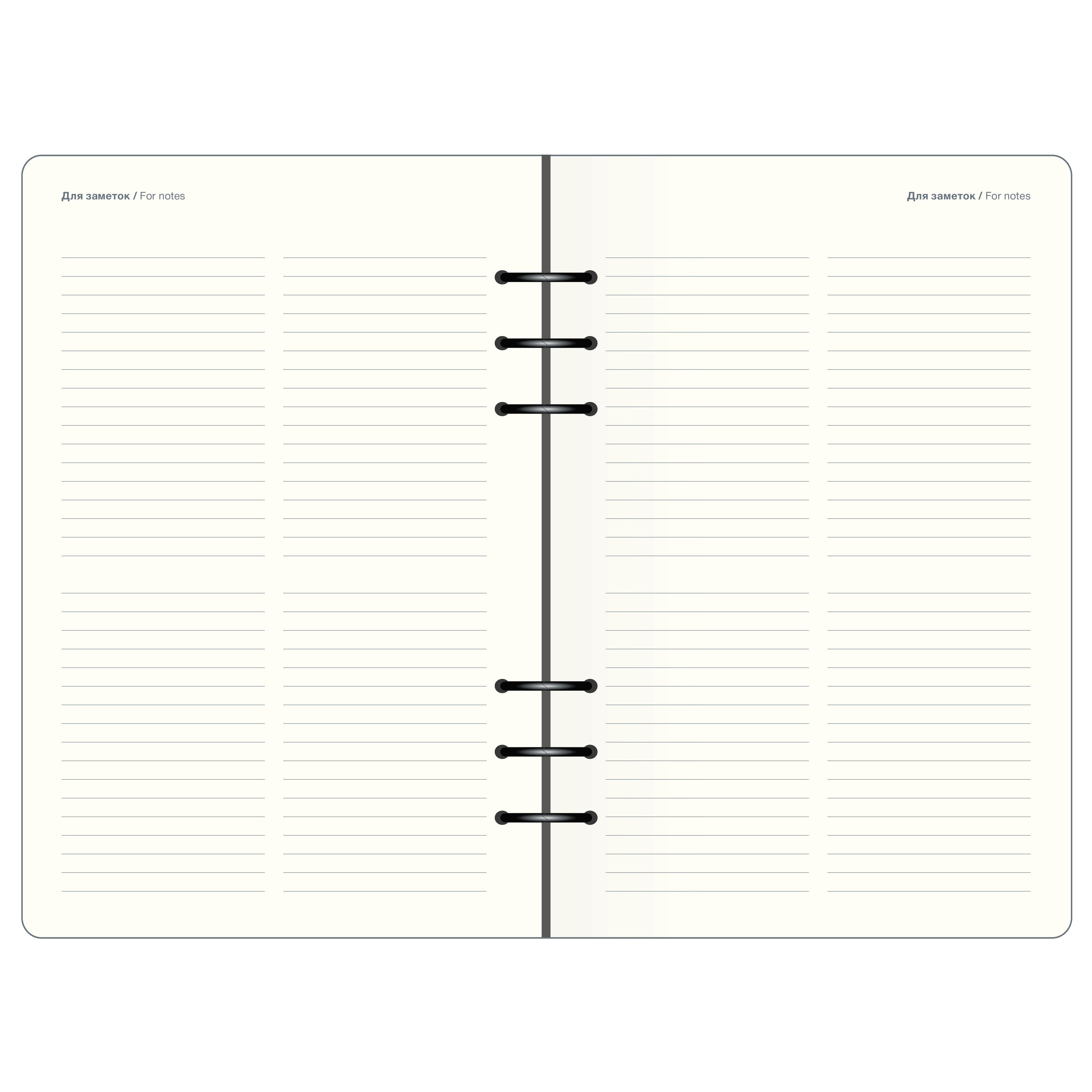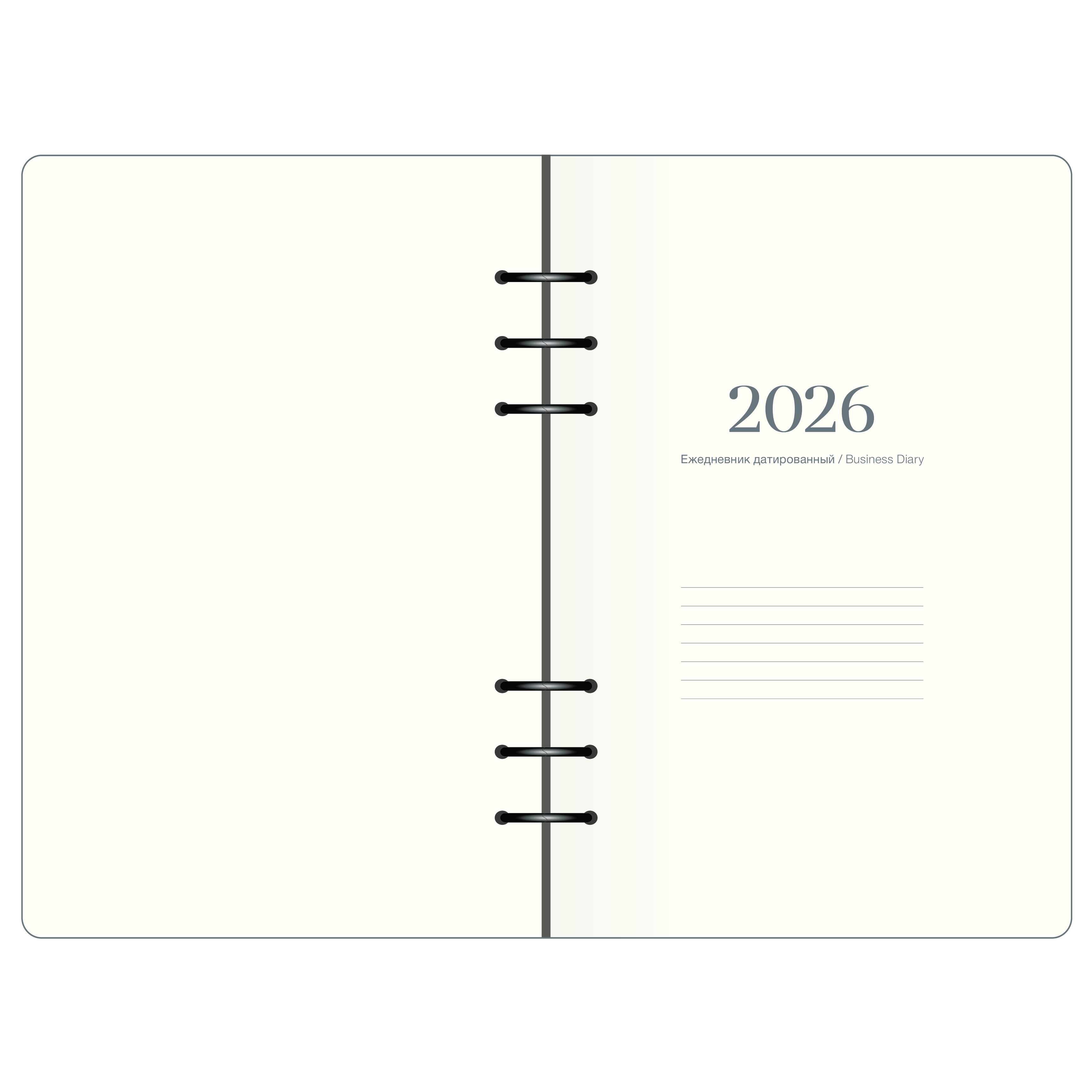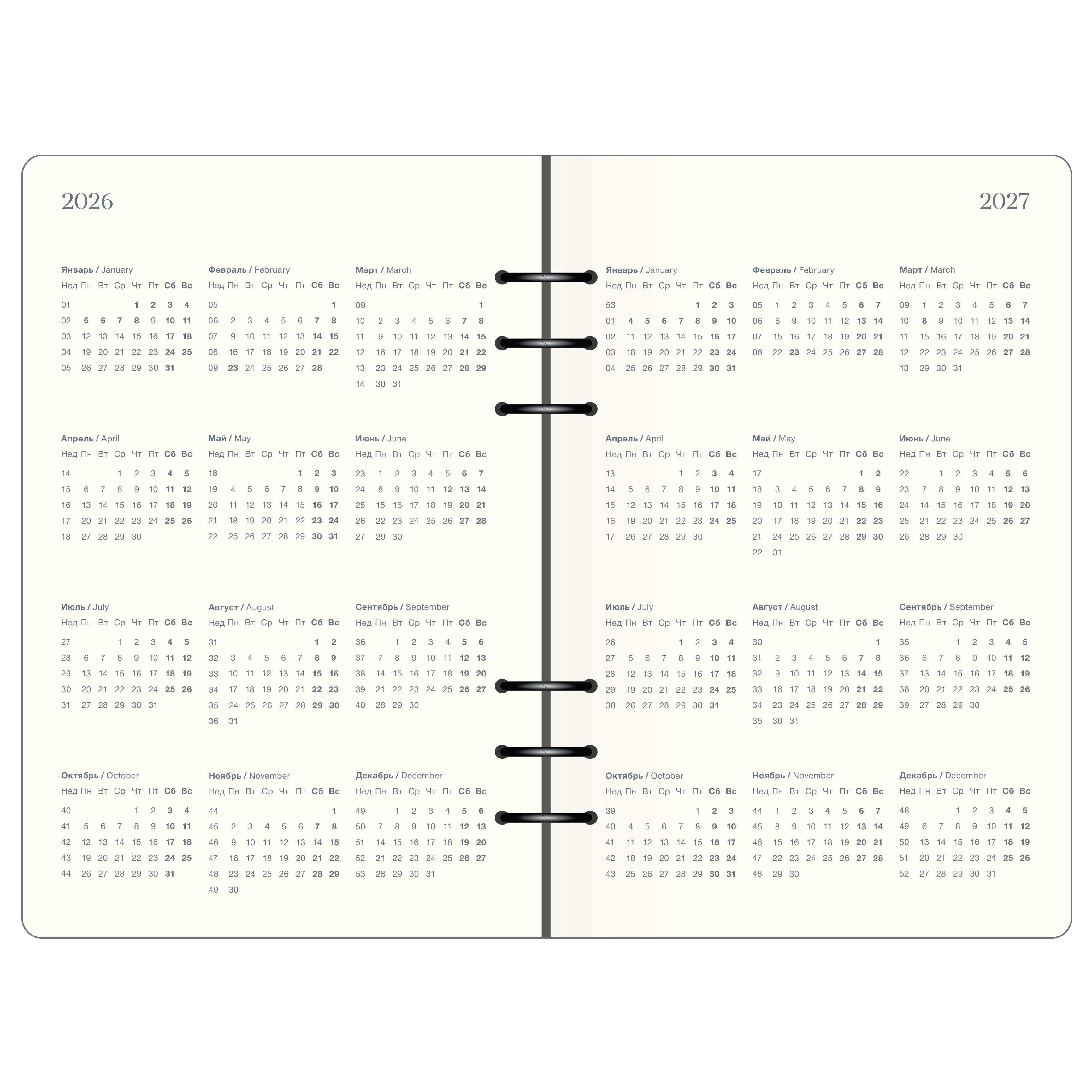 Датированный внутренний блок в линейку на 160 листов (320 страниц) - из высококачественной бумаги цвета слоновой кости плотностью 70 г/м2. Информационный блок ежедневника включает в себя: титульный лист, календари на 2026-2027 гг и развороты для заметок в начале и конце блока.