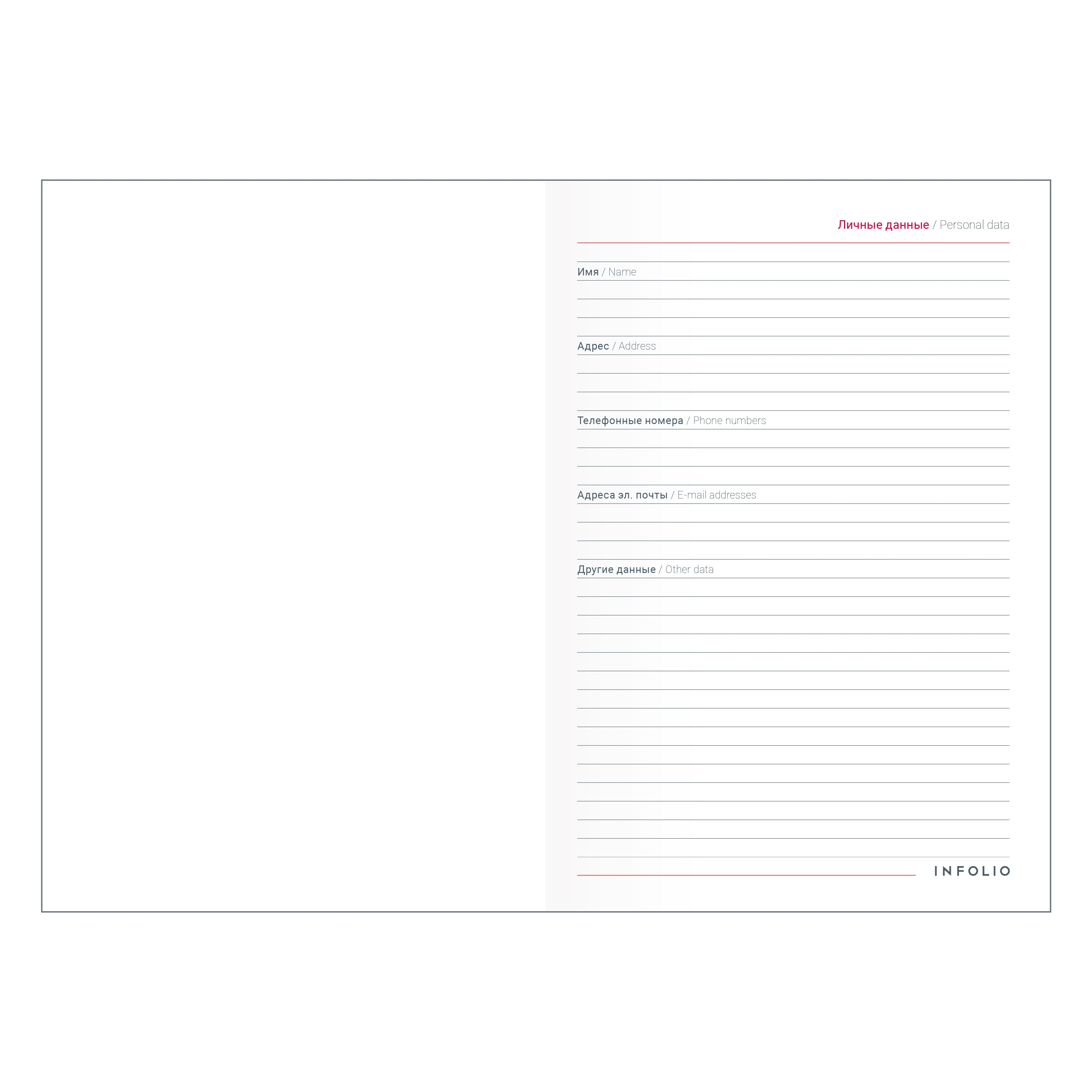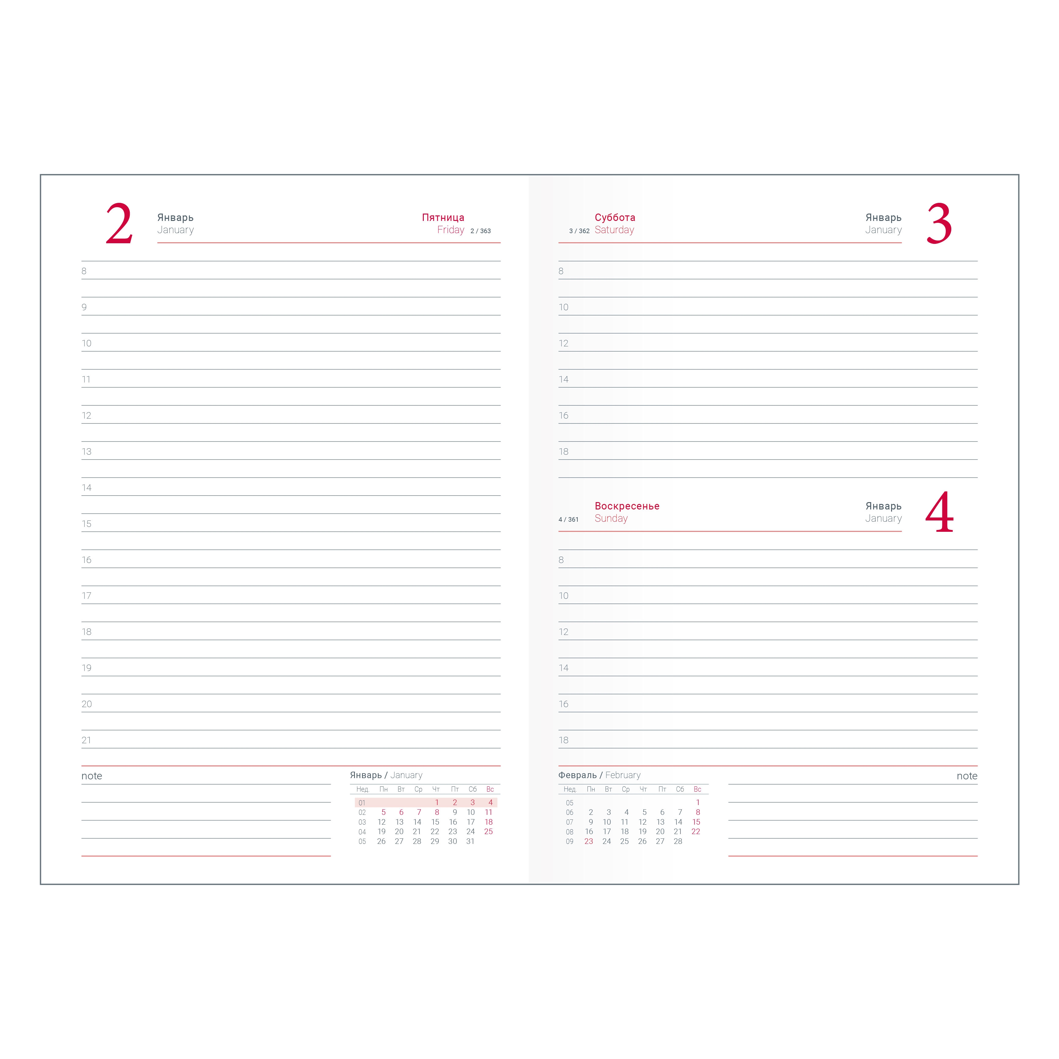 Датированный внутренний блок в линейку на 176 листов (352 страницы) - из высококачественной бумаги белизной 100% и плотностью 70 г/м2. Информационный блок ежедневника включает в себя: календари на 2026-2027 гг, раздел "планы на год", развороты для заметок в начале и конце блока, планнер перед каждым месяцем.