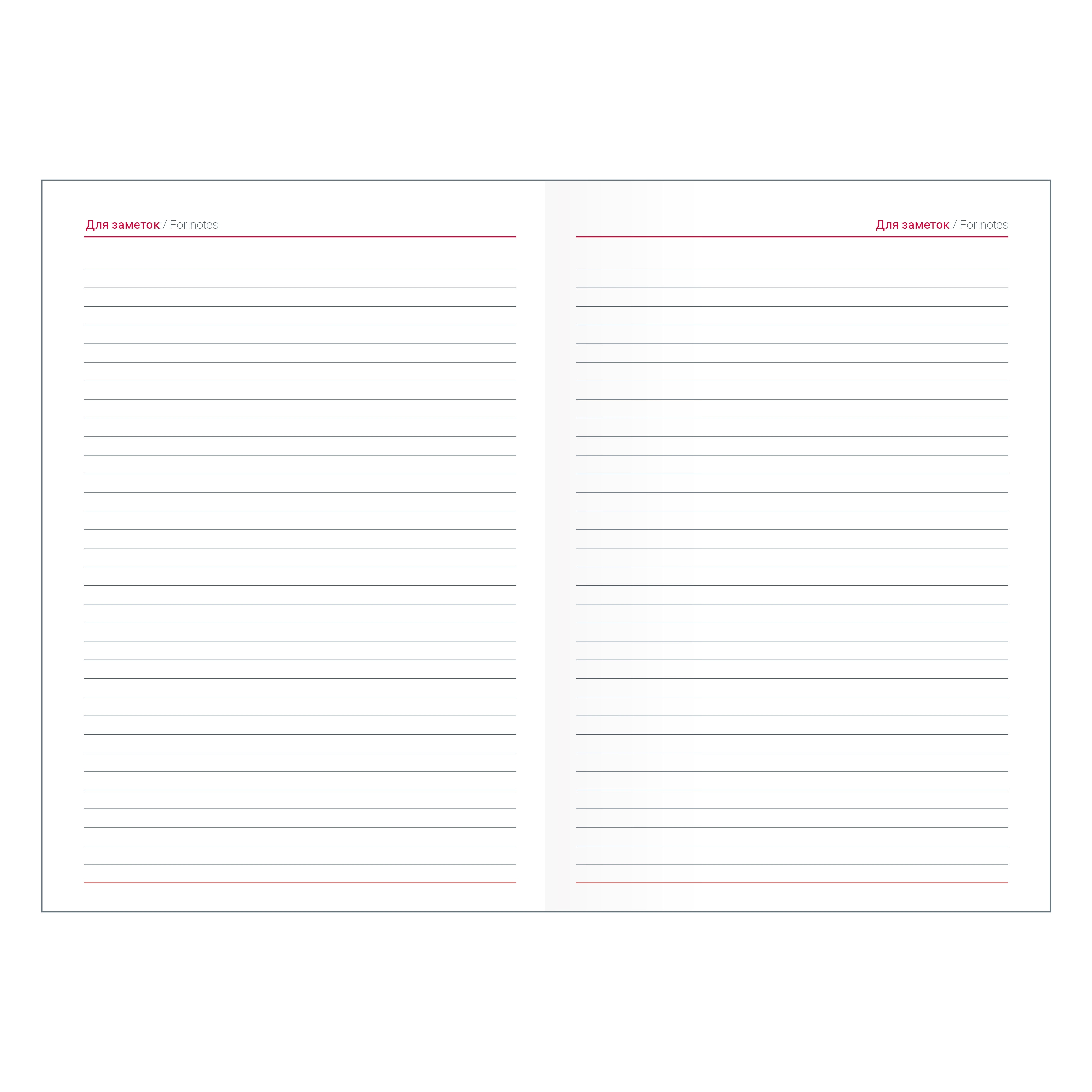 Датированный внутренний блок в линейку на 176 листов (352 страницы) - из высококачественной бумаги белизной 100% и плотностью 70 г/м2. Информационный блок ежедневника включает в себя: календари на 2026-2027 гг, раздел "планы на год", развороты для заметок в начале и конце блока, планнер перед каждым месяцем.