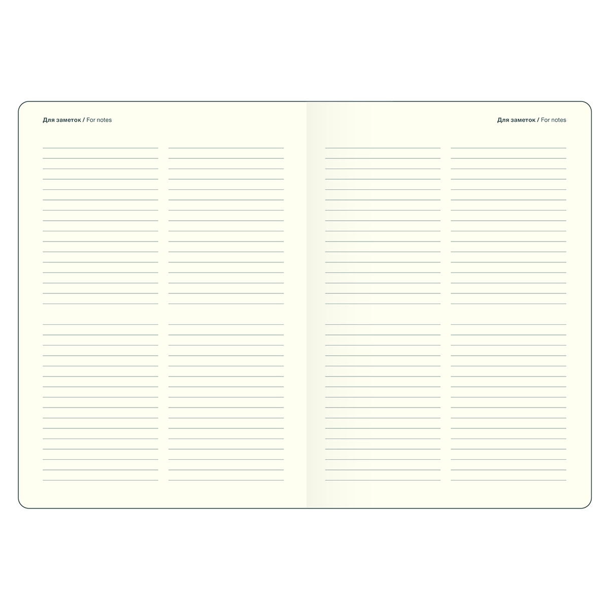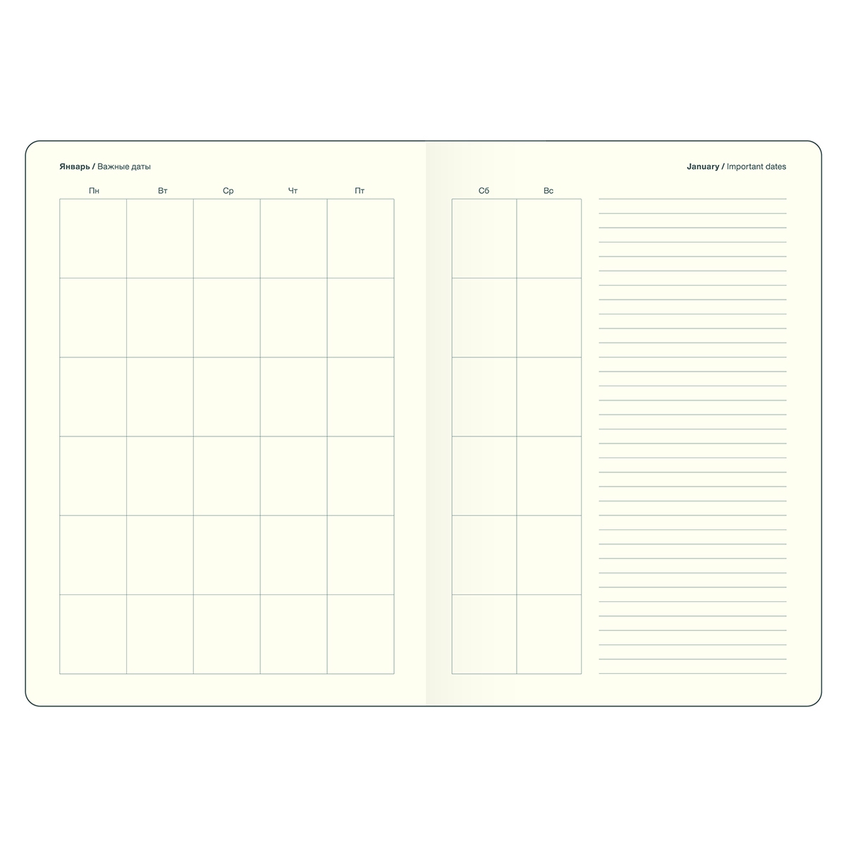 Недатированный внутренний блок в линейку на 160 листов (320 страниц) - из высококачественной бумаги цвета слоновой кости плотностью 70 г/м2 с окрашенным в золото обрезом. Информационный блок ежедневника включает в себя: титульный лист, планнер на каждый месяц и развороты для заметок в начале и конце блока.