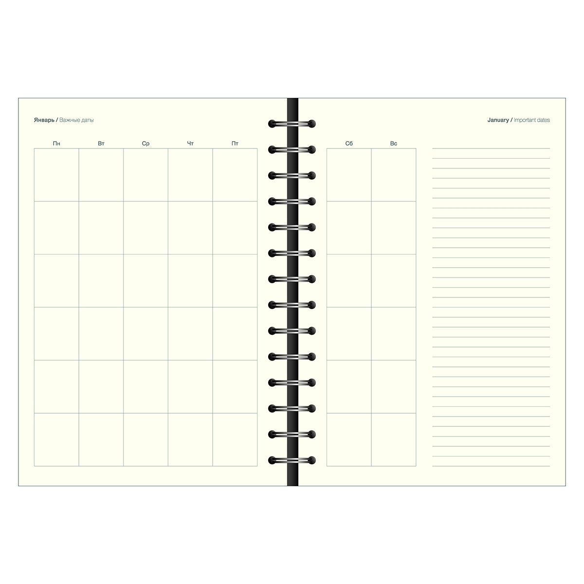 Недатированный внутренний блок в клетку на 96 листов (192 страницы) - из высококачественной бумаги цвета слоновой кости плотностью 70 г/м2. Информационный блок тетради включает в себя: титульный лист и планнер на каждый месяц.