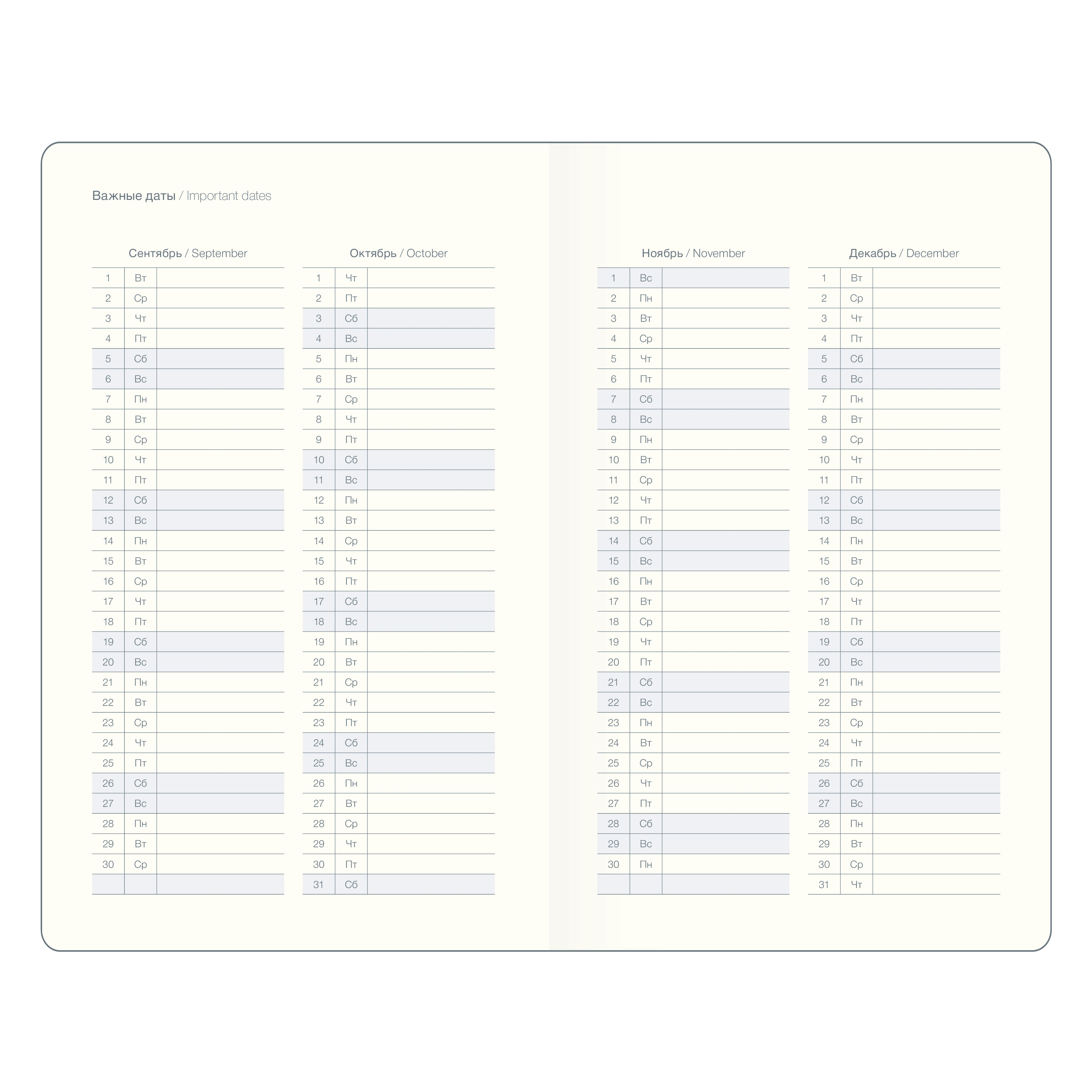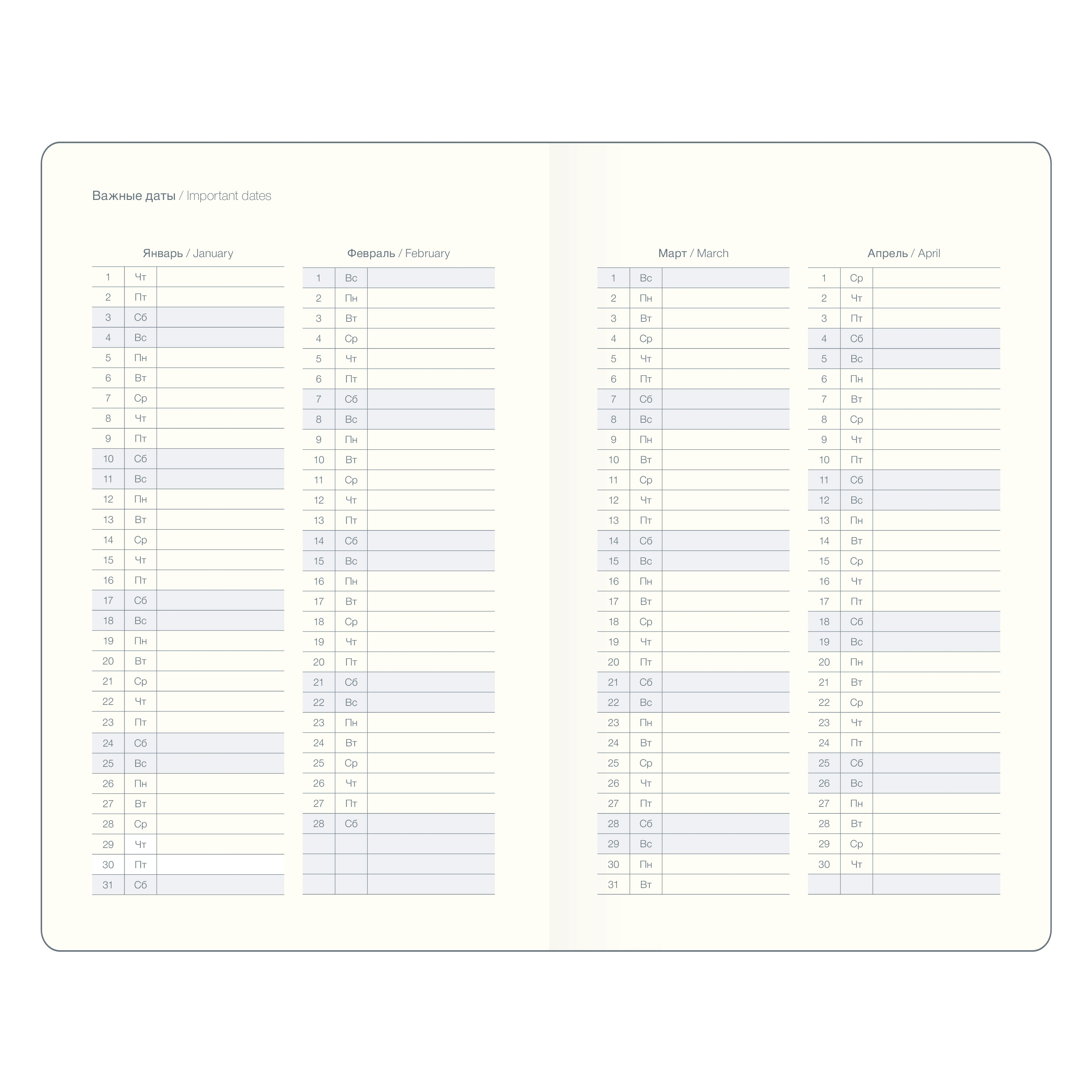 В еженедельнике также имеются две удобные атласные закладки, которые помогут быстро найти нужные развороты.