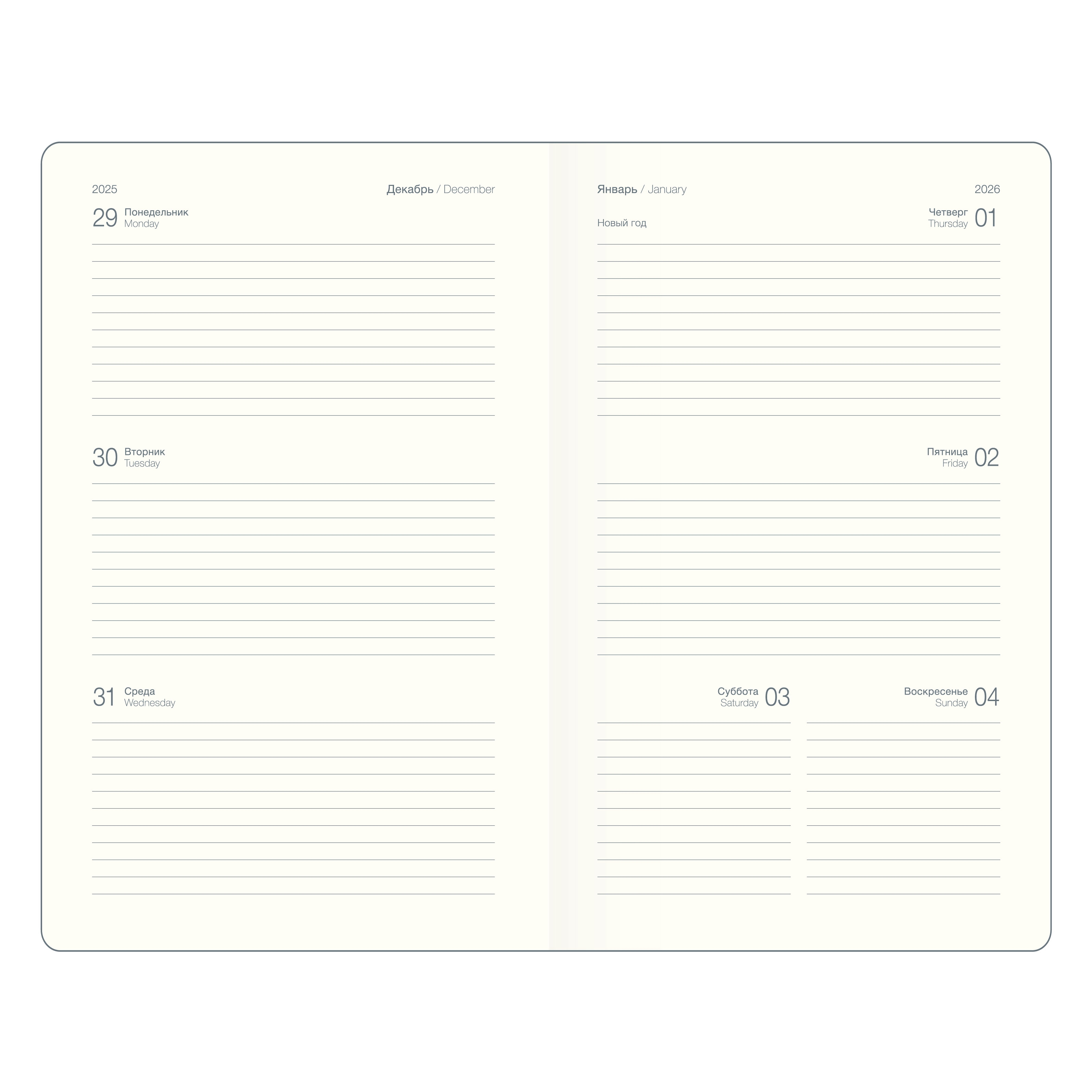Компактный датированный на 2026 год еженедельник формата А5- (130х205 мм) будет не только незаменимым помощником в ведении дел, но и станет стильным аксессуаром, отражающим индивидуальность владельца.