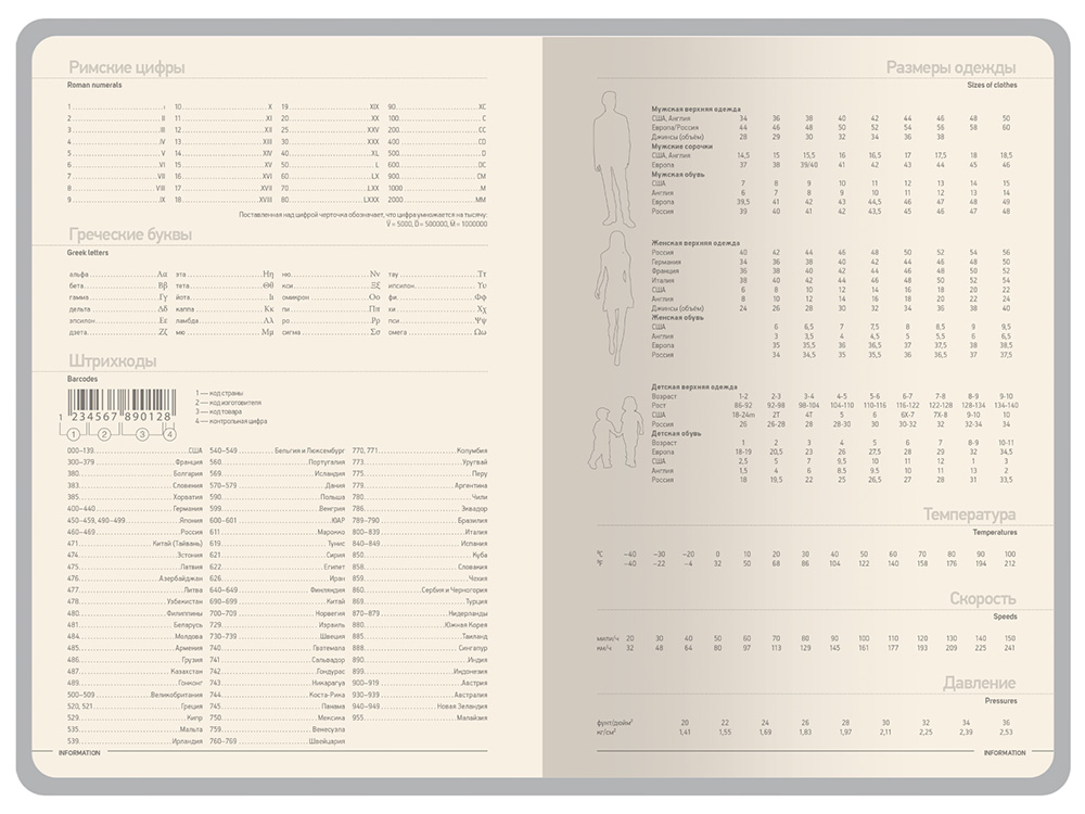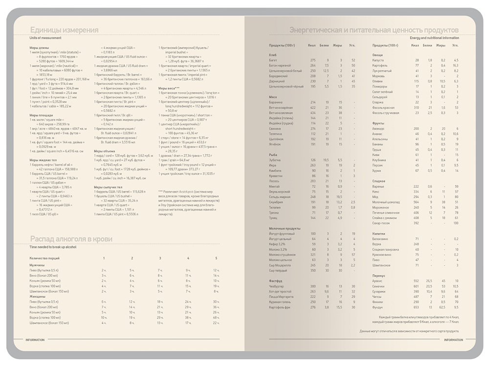 Недатированные страницы в серую линейку имеют отдельное место для проставления числа месяца и дня недели. Справочный блок на 17 страницах содержит полезную информацию из различных областей.