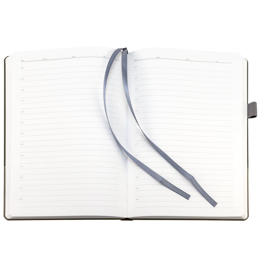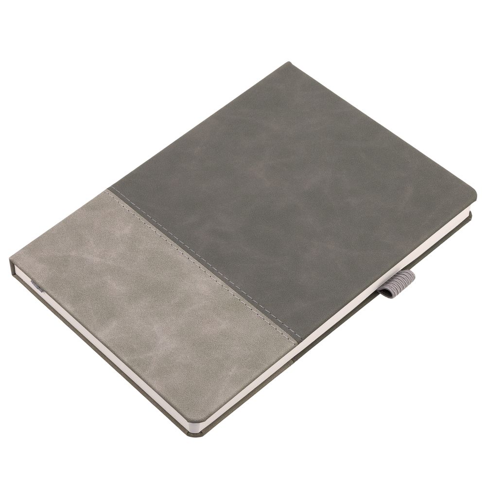 Ежедневник с твердой обложкой, без поролона, со сшивкой материалов Nubuck Touch серый СС, и Nubuck Touch тёмно-серый ЕЕ., дополнен двойным ляссе и петлей-резинкой для ручки.