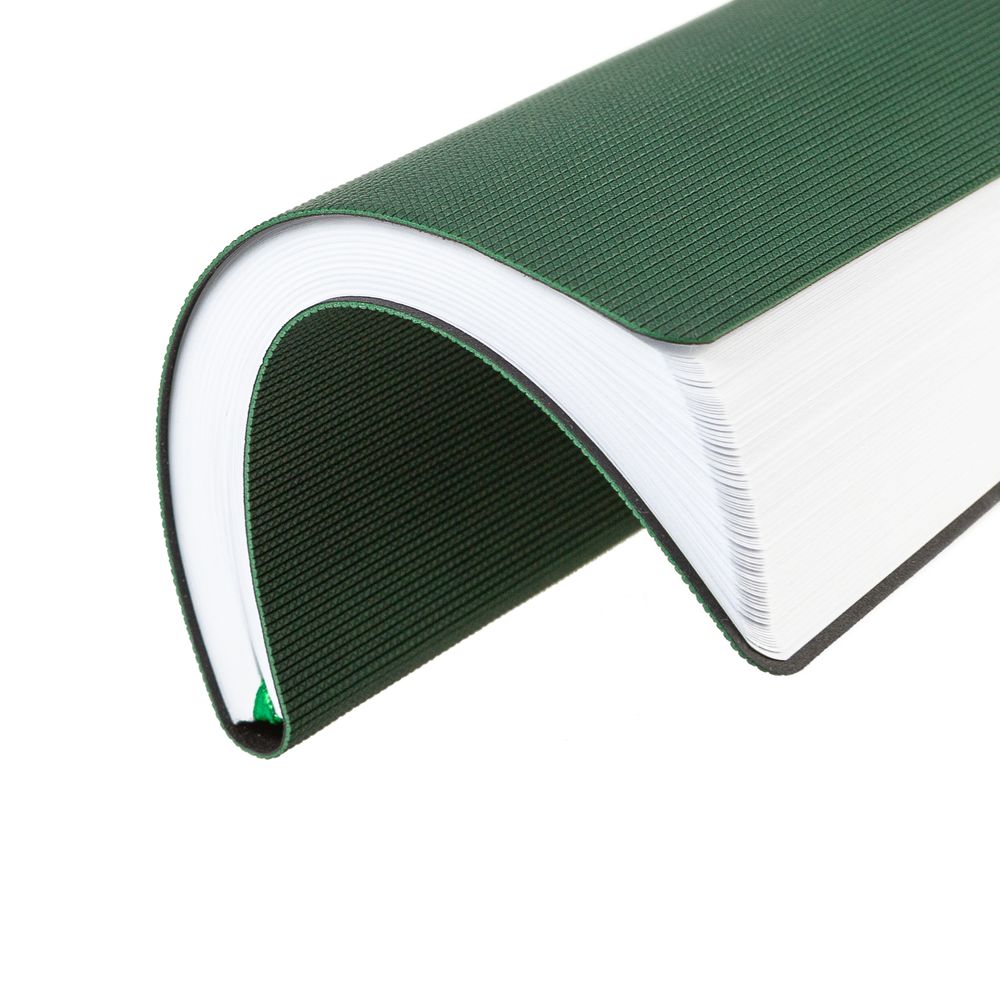 Ежедневник с гибкой обложкой, выполнен из материала Canyon, зеленый FF, дополнен ляссе в цвет обложки. Блинтовое тиснение на обложке создает эффект вязаного полотна.