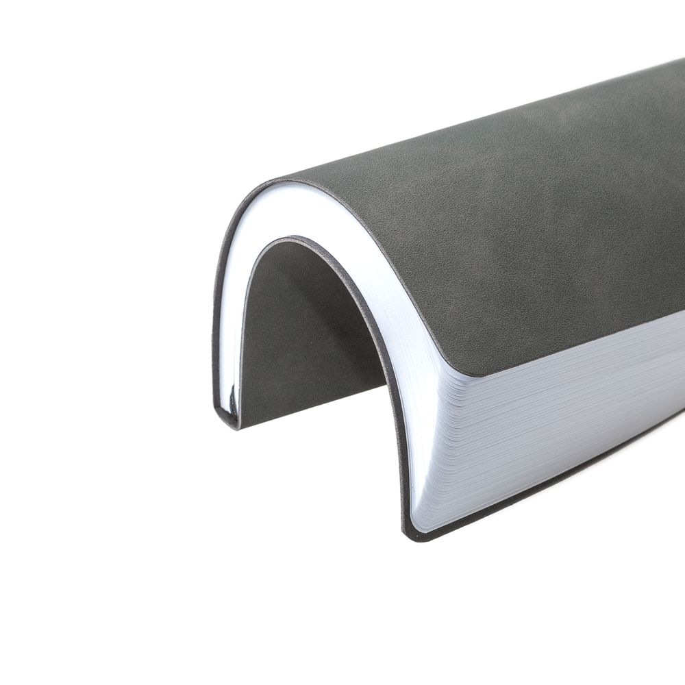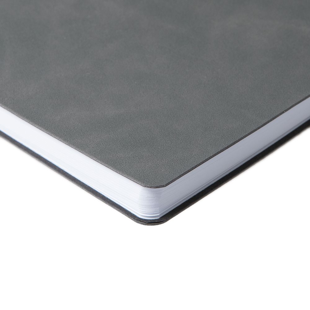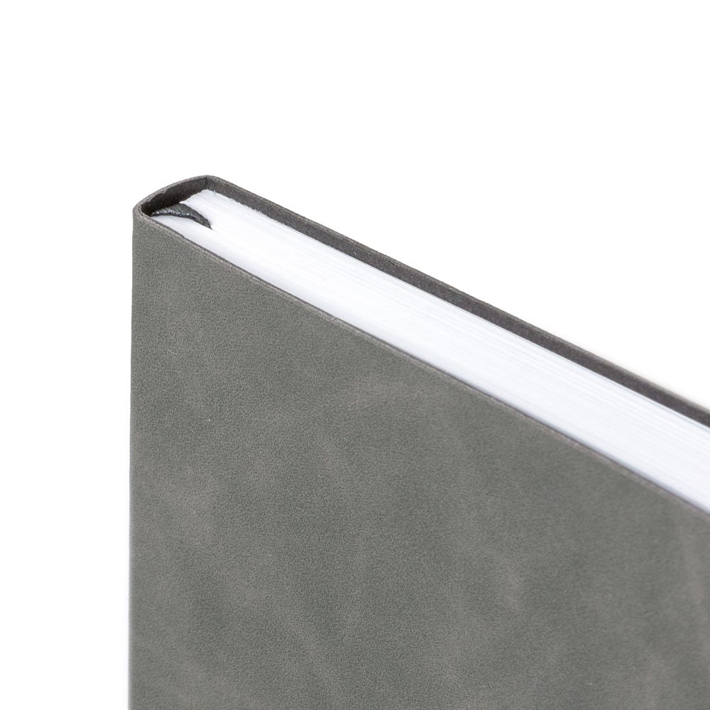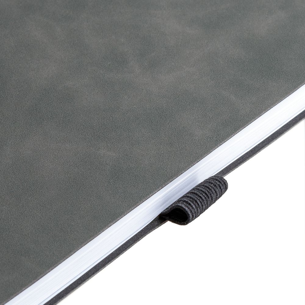 Ежедневник с гибкой обложкой, выполнен из материала Nubuck Touch, серый СС, дополнен ляссе и петлей-резинкой для ручки черного цвета.