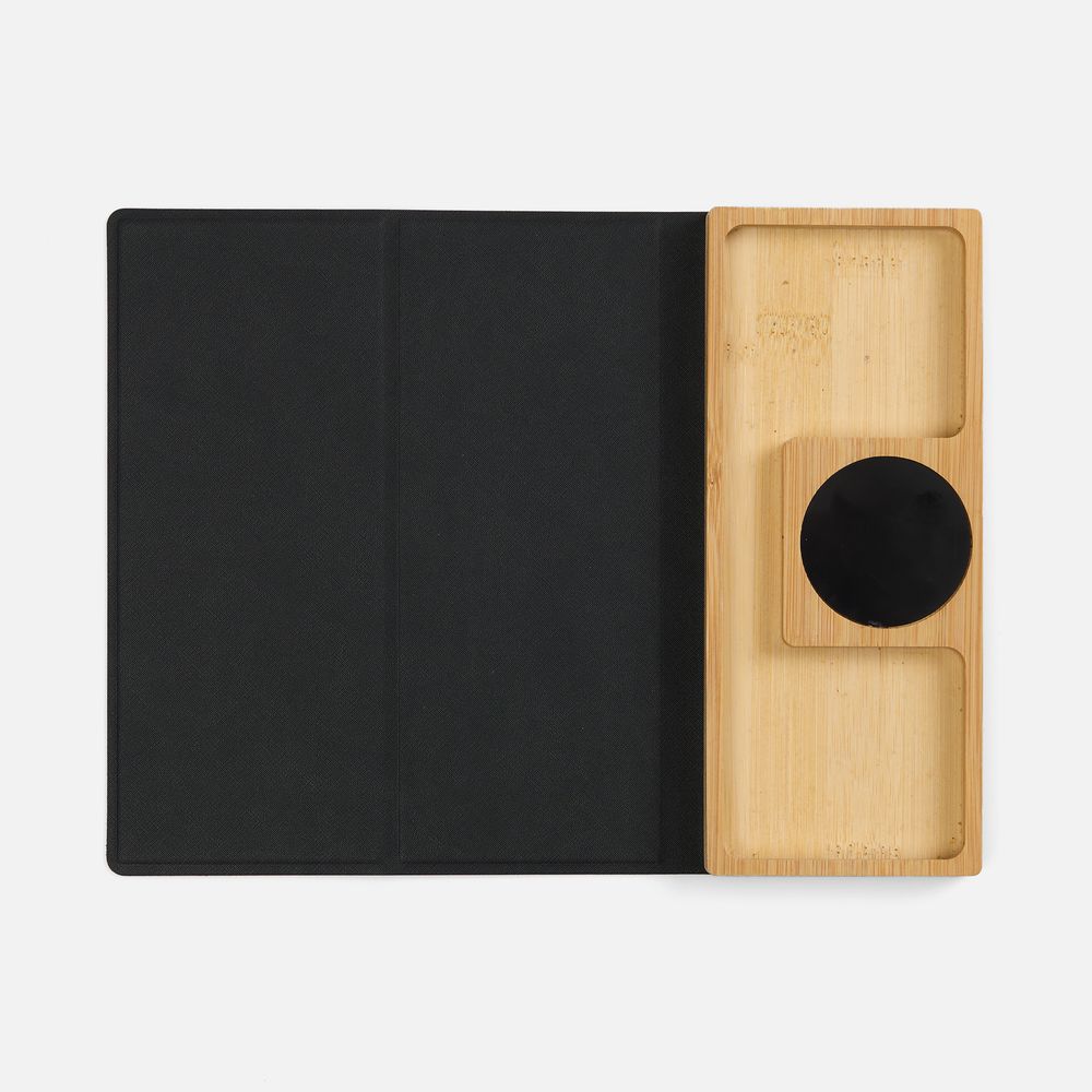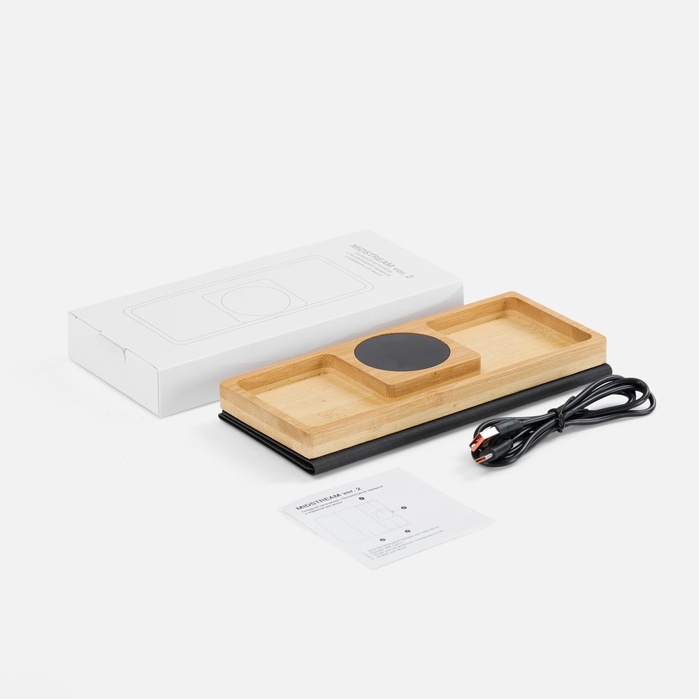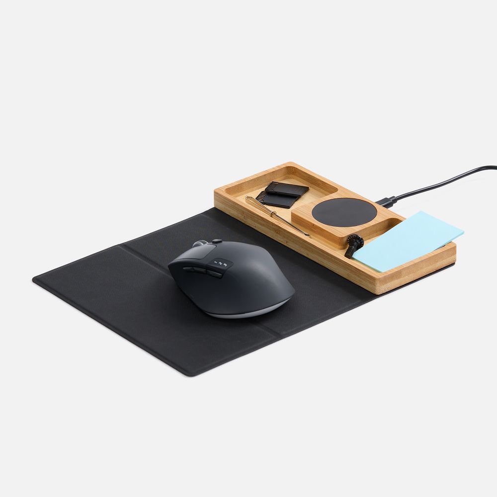 Midstream — это коврик для мышки с плошадкой для беспроводной зарядкой и лоткрм для канцелярских принадлежностей. Его можно использовать как на рабочем столе, так и в дороге или на встречах, так как он компактно складывается и не занимает много места в сумке или футляре для ноутбука.