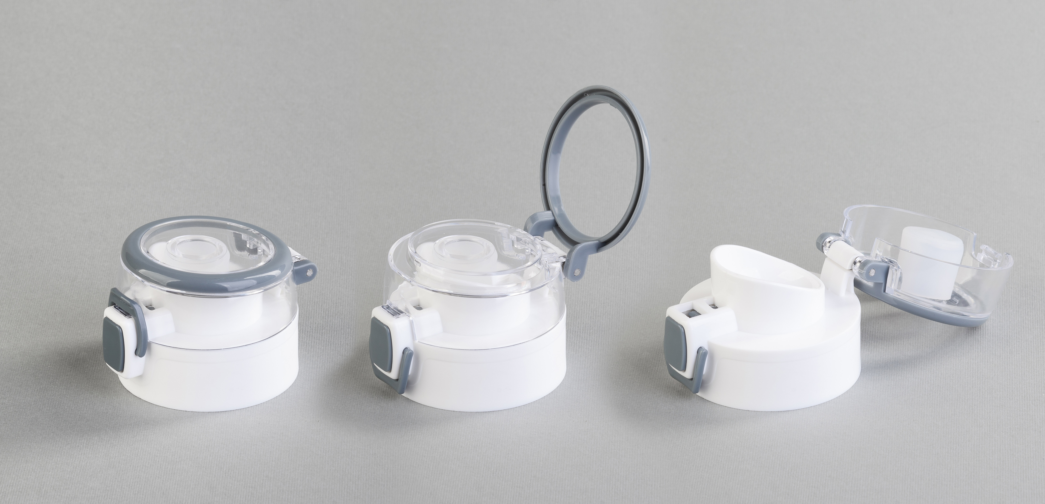 Удобная система открытия, не нужно ничего крутить, достаточно нажать кнопку. Угол открытия крышки более 180º, так она не мешает при питье.
