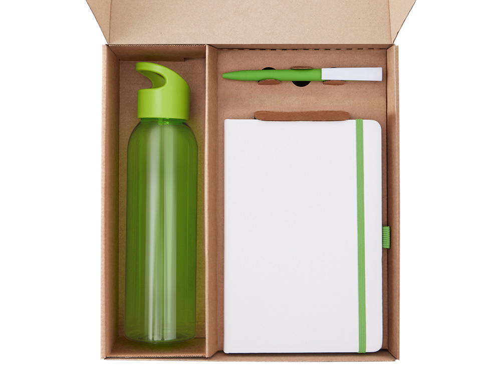 Подарочный набор с бутылкой для воды. блокнотом, ручкой и ланчбоксом, зеленое яблоко
