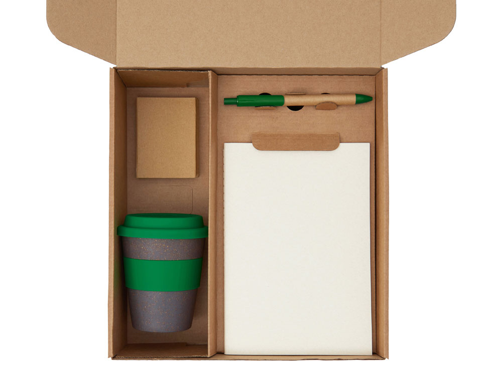 | Материал | блокнот- бумага из переработанных тетра-паков, ручка- картон,пластик, стакан- 50% бамбуковое волокно, 50% полипропилен, коробка- картон |