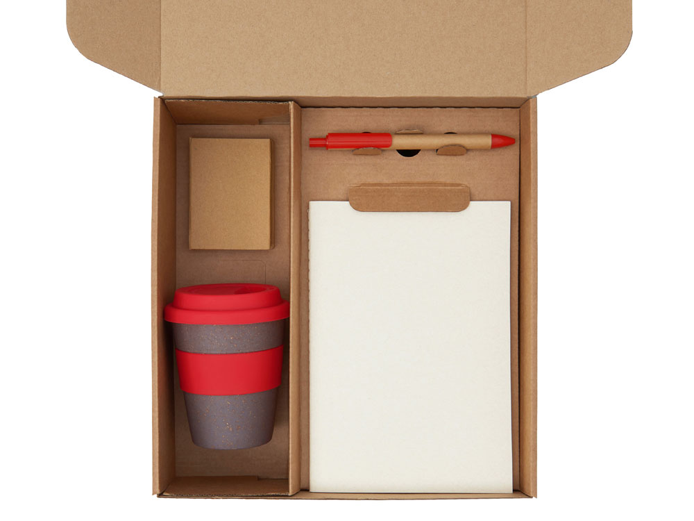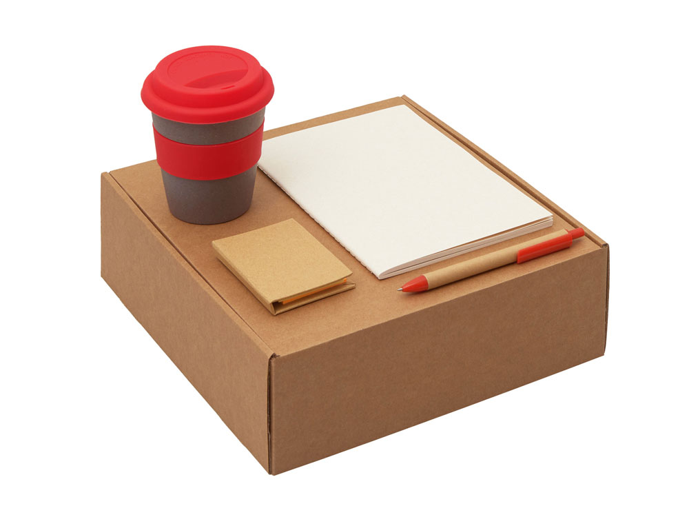 | Материал | блокнот- бумага из переработанных тетра-паков, ручка- картон,пластик, стакан- 50% бамбуковое волокно, 50% полипропилен, коробка- картон |