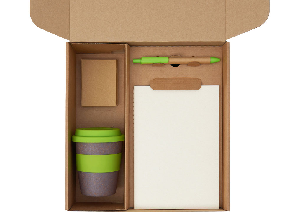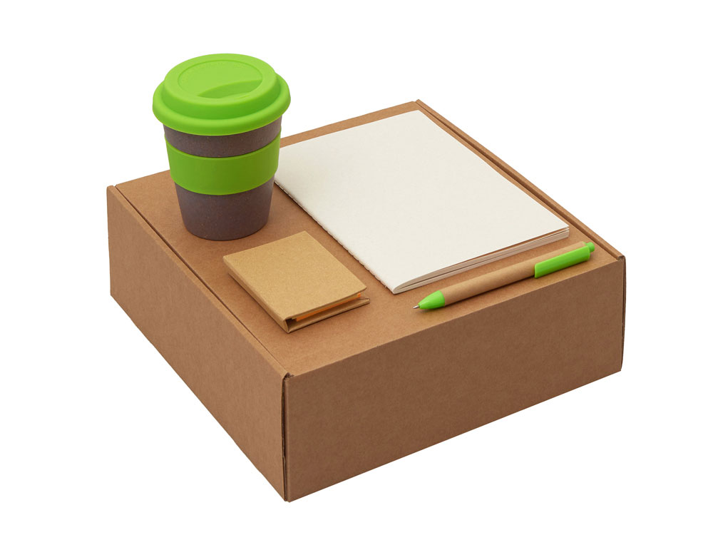 | Материал | блокнот- бумага из переработанных тетра-паков, ручка- картон,пластик, стакан- 50% бамбуковое волокно, 50% полипропилен, коробка- картон |