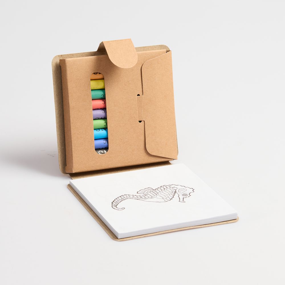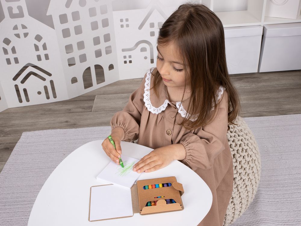 В комплекте 10 цветных восковых мелков и блокнот на 40 страниц для раскрашивания и рисования: 12 страниц с рисунками и 28 чистых страниц. Блокнот и мелки компактно хранятся под одной обложкой.