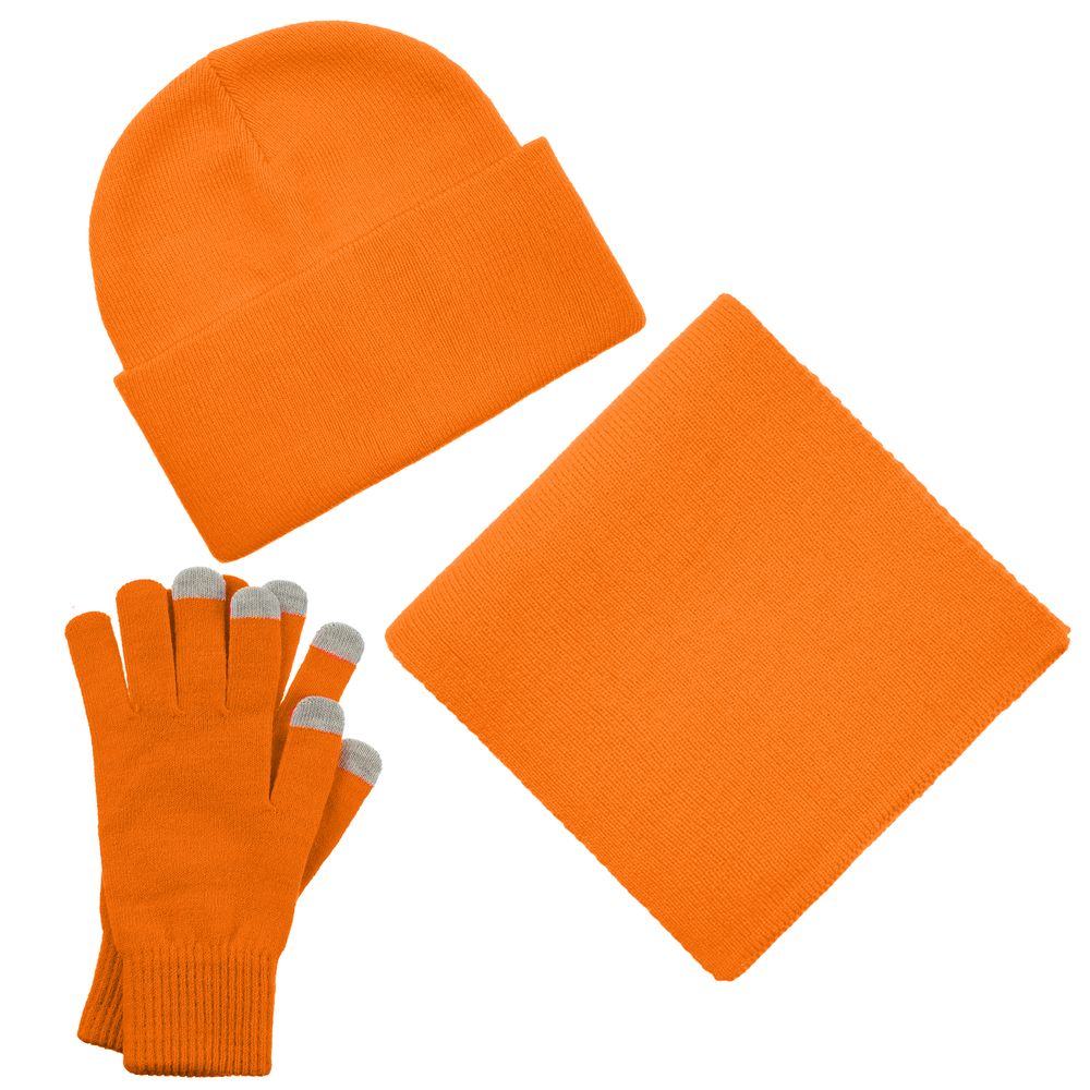 В комплект входят двухслойная шапка с регулируемым отворотом и легкий однослойный шарф из мягкой акриловой пряжи, сохраняющие тепло и защищающие от ветра, а также эргономичные перчатки со специальными токопроводящими волокнами на кончиках пальцев, позволяющие свободно пользоваться смартфоном даже в холодную погоду. Универсальная цветовая гамма и лаконичный дизайн делают набор органичным дополнением к любой верхней одежде.