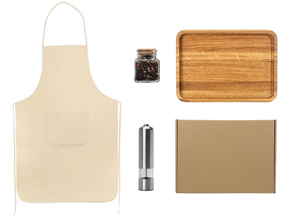 Подарочный набор для кухни с фартуком, подносом, мельницей и специями