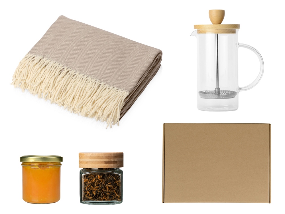 Подарочный набор с пледом, френчпрессом, чаем и вареньем, бежевый