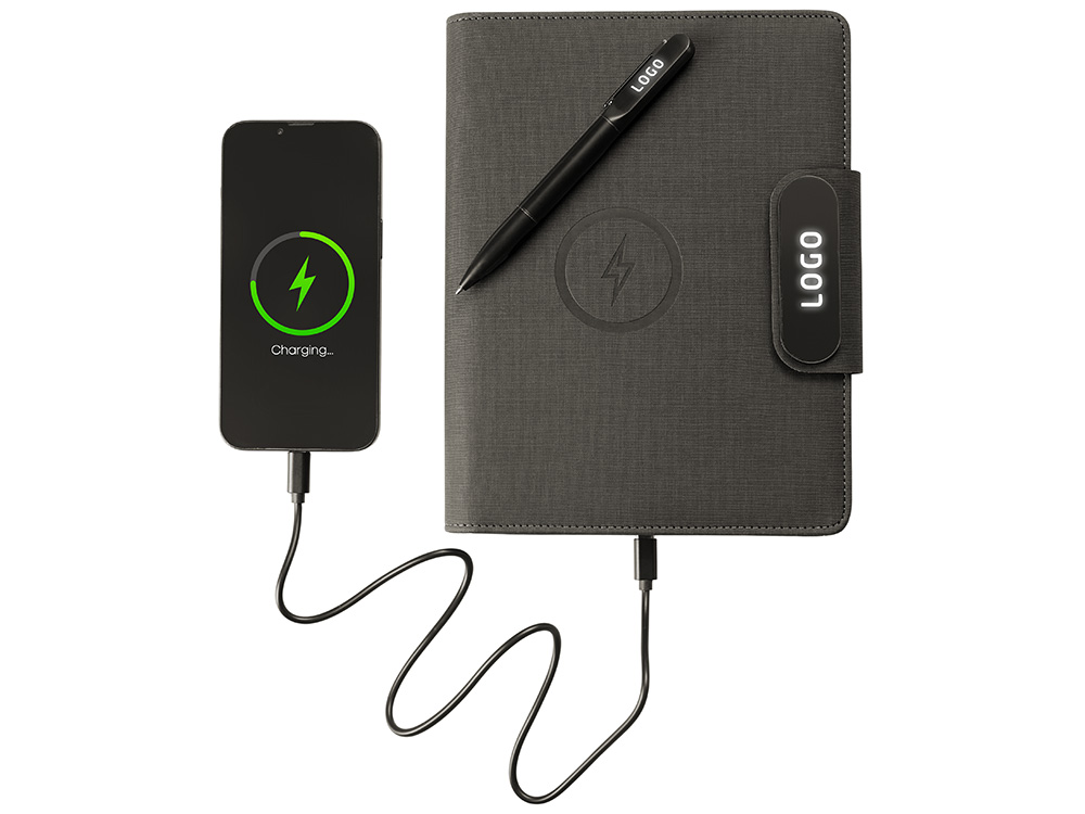 Подарочный набор Twilight — стильный и современный бизнес-подарок, который в полной мере воплощает идею многофункциональности. Он состоит из органайзера формата А5, с помощью которого можно заряжать гаджеты как беспроводным способом, так и через кабель, фиксировать телефон для просмотра видео или проведения конференций, хранить ручку и делать записи, а также самой металлической ручки. Клапан органайзера и в верхняя часть ручки светятся при гравировке логотипа, что делает набор стильным, а лого более ярким и заметным. Практичный и технологичный аксессуар, который в состоянии заменить сразу несколько вещей.