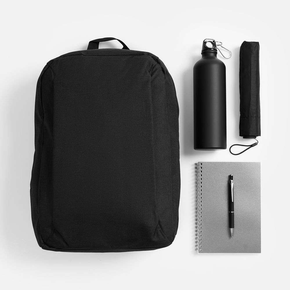 | Материал | рюкзак - полиэстер, 600D; купол зонта - полиэстер, 300T; спицы - стеклопластик; ручка зонта - прорезиненный пластик; рама зонта, бутылка для воды - алюминий; блокнот - картон, бумага; пластик; ручка - металл, грип - пластик; покрытие софт-тач |