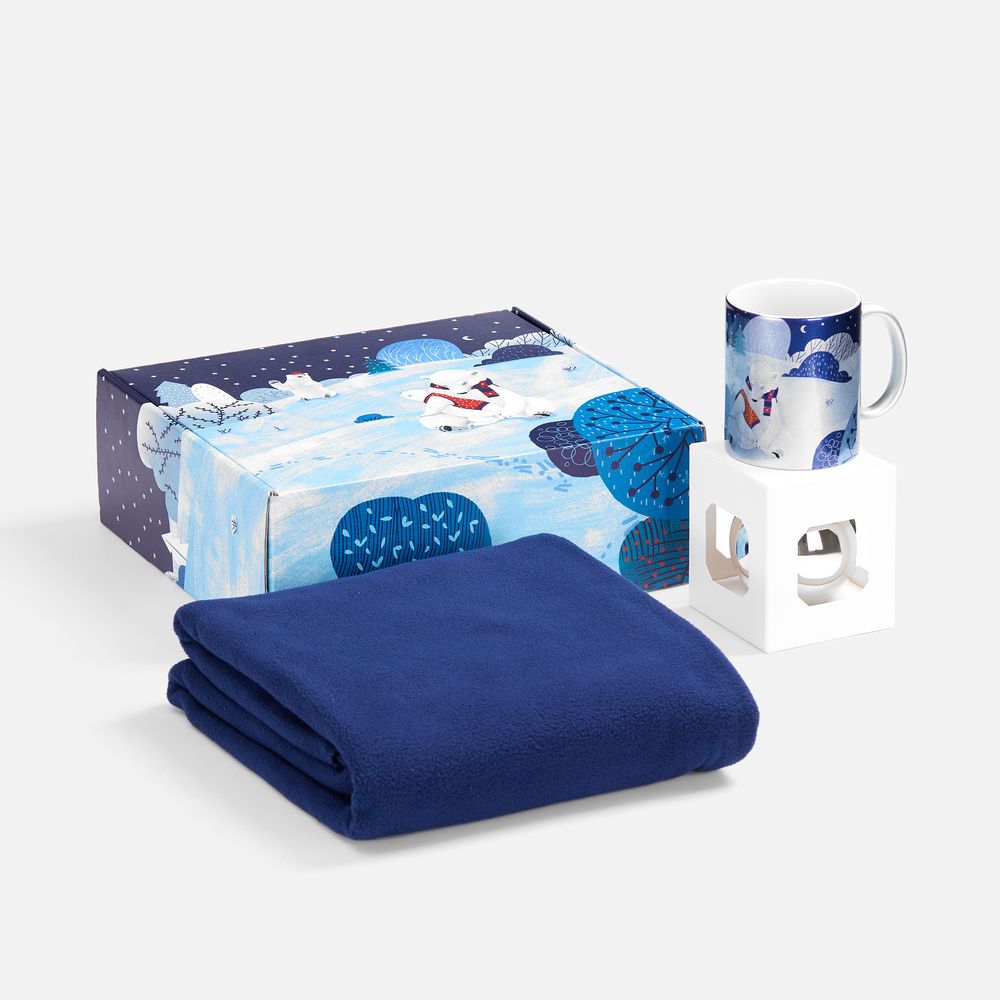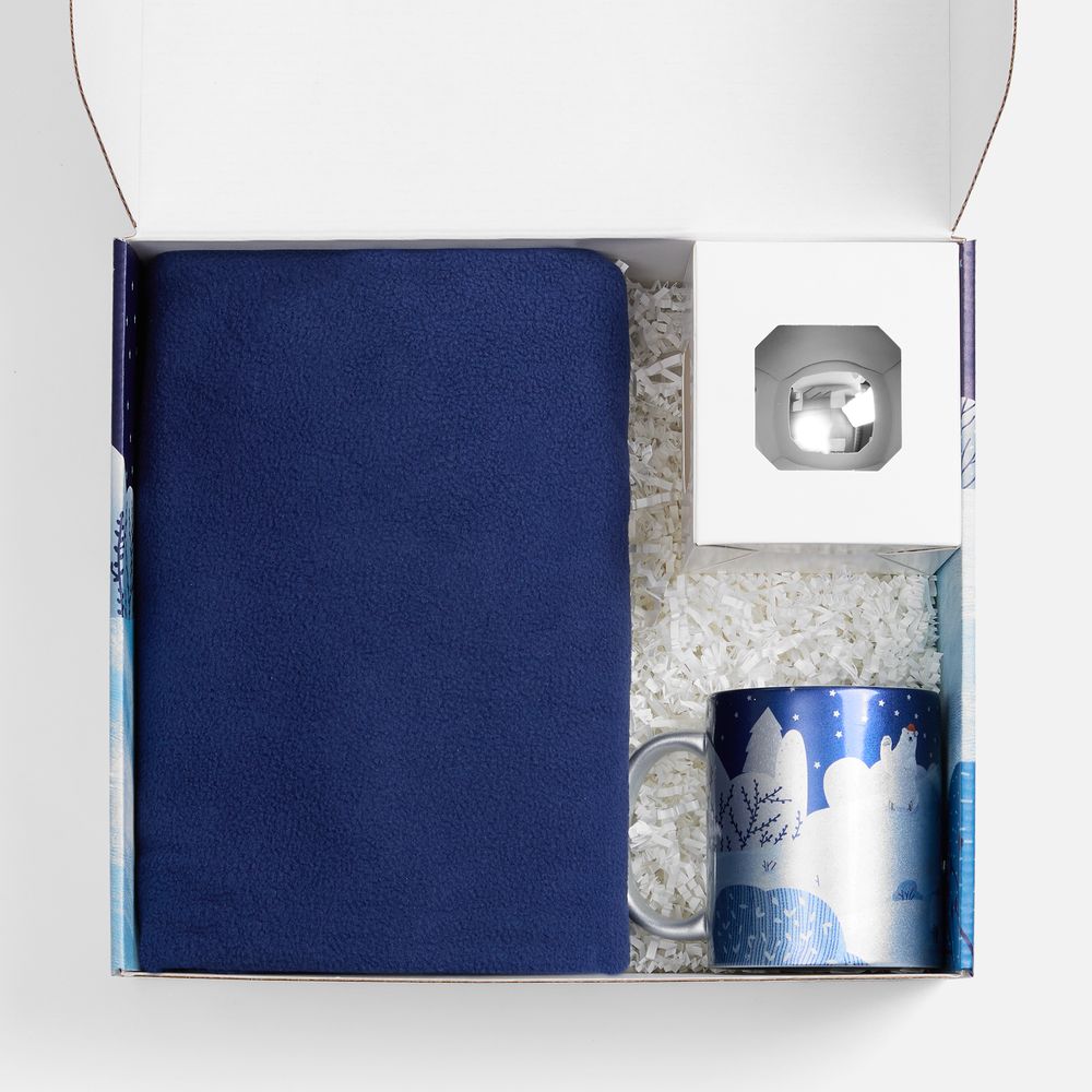 Набор «Праздничный полюс» приглашает окунуться в мир настоящей зимней эстетики и волшебной безмятежности! Это новогодний ансамбль в едином нарядном стиле: мягкий флисовый плед, кружка с тематическим принтом и изящный елочный шарик. Немного сказочные изображения с милыми белыми мишками на подарочной коробке и кружке задают тон всему набору, вызывая радость и улыбку.