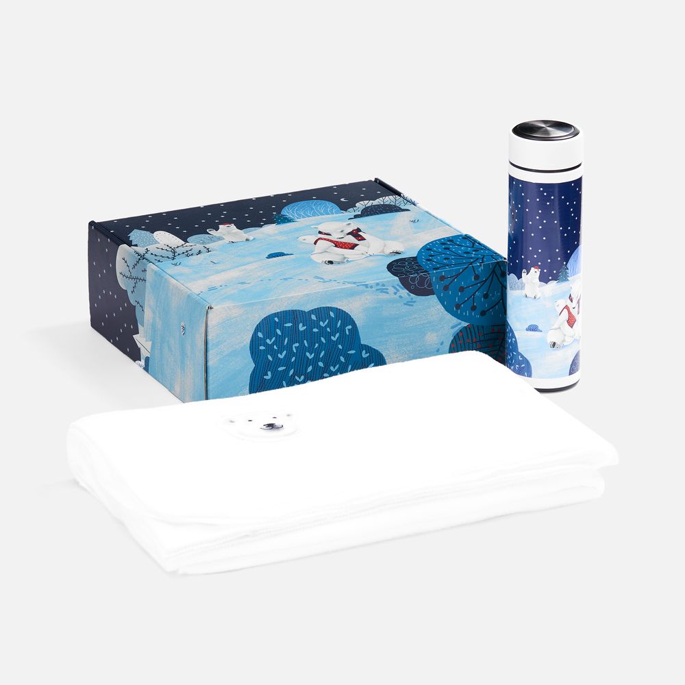 «Мишкин очаг» — это теплое объятие зимнего уюта в красочной подарочной упаковке. Здесь практичность встречается с волшебством: белый флисовый плед, словно припудренный первым снегом, в компании с лаконичным термосом поможет поддержать внутреннее тепло.