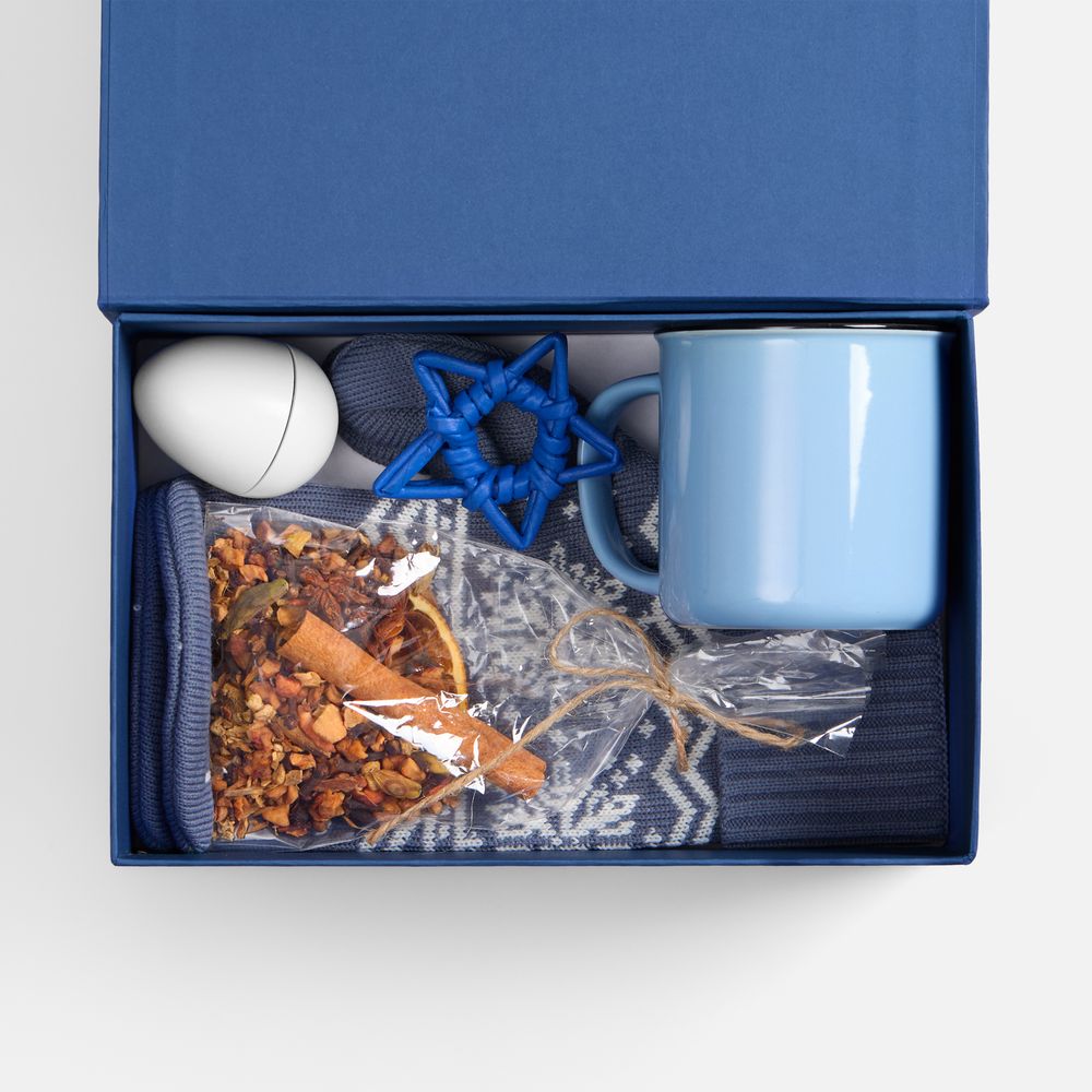 | Материал | варежки - акрил 100%; футляр для бальзама - пластик; кружка - фаянс; плетеная фигурка - бумага; коробка - переплетный картон, бумага Malmero «Скандинавский синий» |