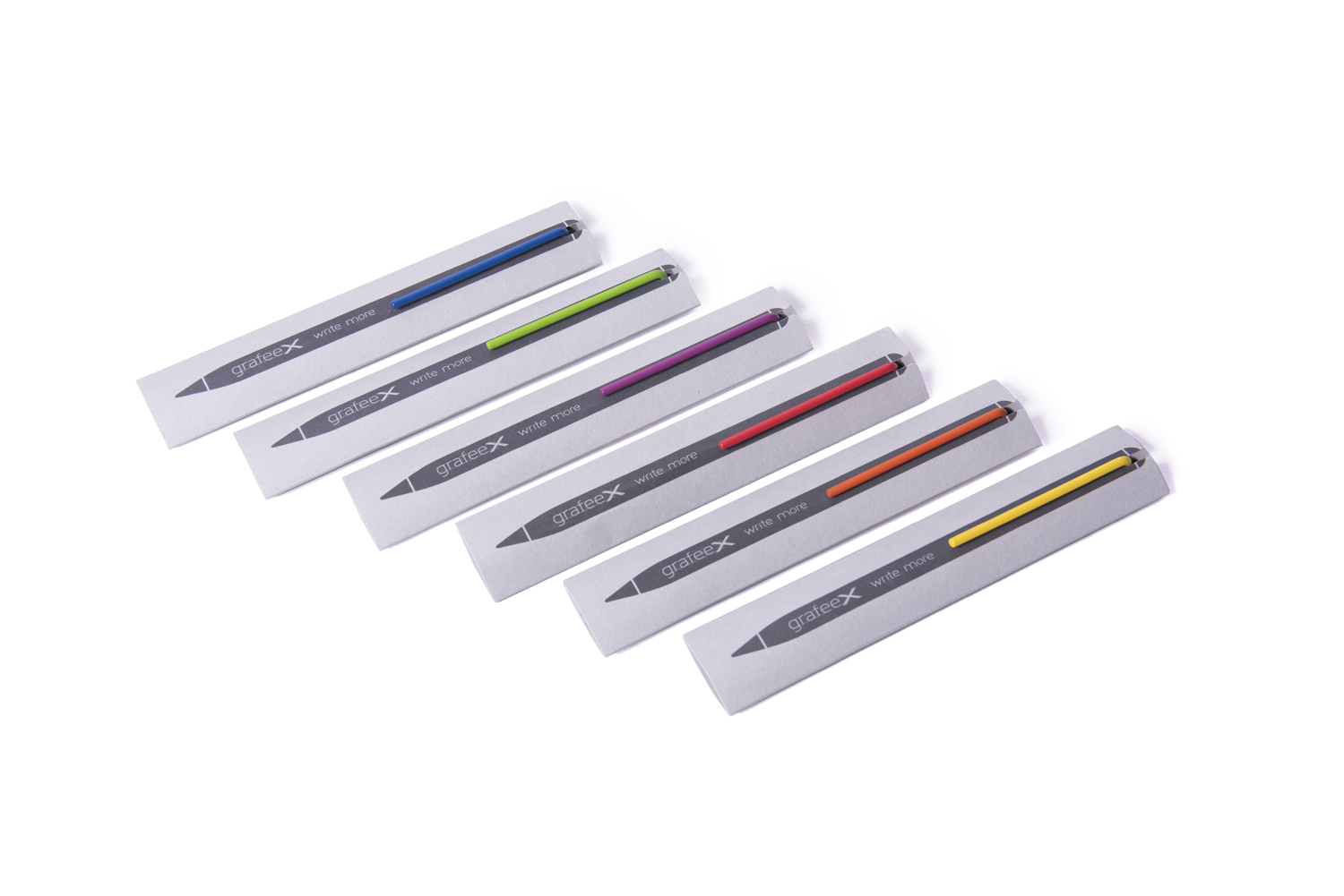 Инновационный, совершенно необычный карандаш с цельным алюминиевым матовым корпусом черного цвета, ярко-синим клипом и пишущим наконечником из материала GrafeeX. GrafeeX - это запатентованный инновационный материал, полученный в результате спекания мелких частиц графита при высоких температурах. То есть он пишет, как обычный графитовый карандаш, но из-за высокой плотности материала крайне экономно расходуется, и его хватает очень надолго. Карандаш вкладывается в элегантный темно-серый чехол с контрастной прострочкой в цвет клипа, сшитый вручную из рециклированной кожи. GrafeeX станет идеальным помощником в повседневной жизни: для заметок, для набросков или просто для записи идей на бумаге.