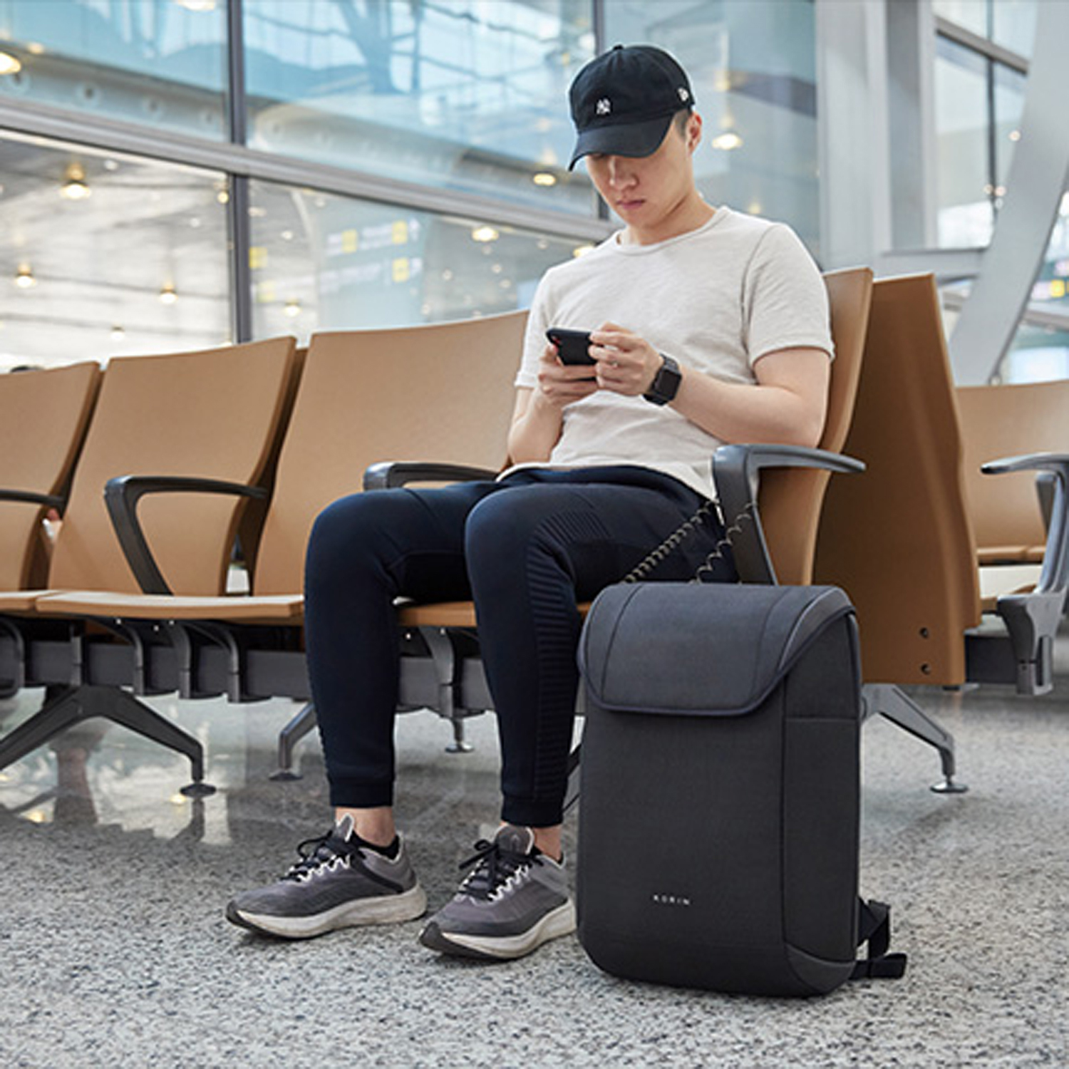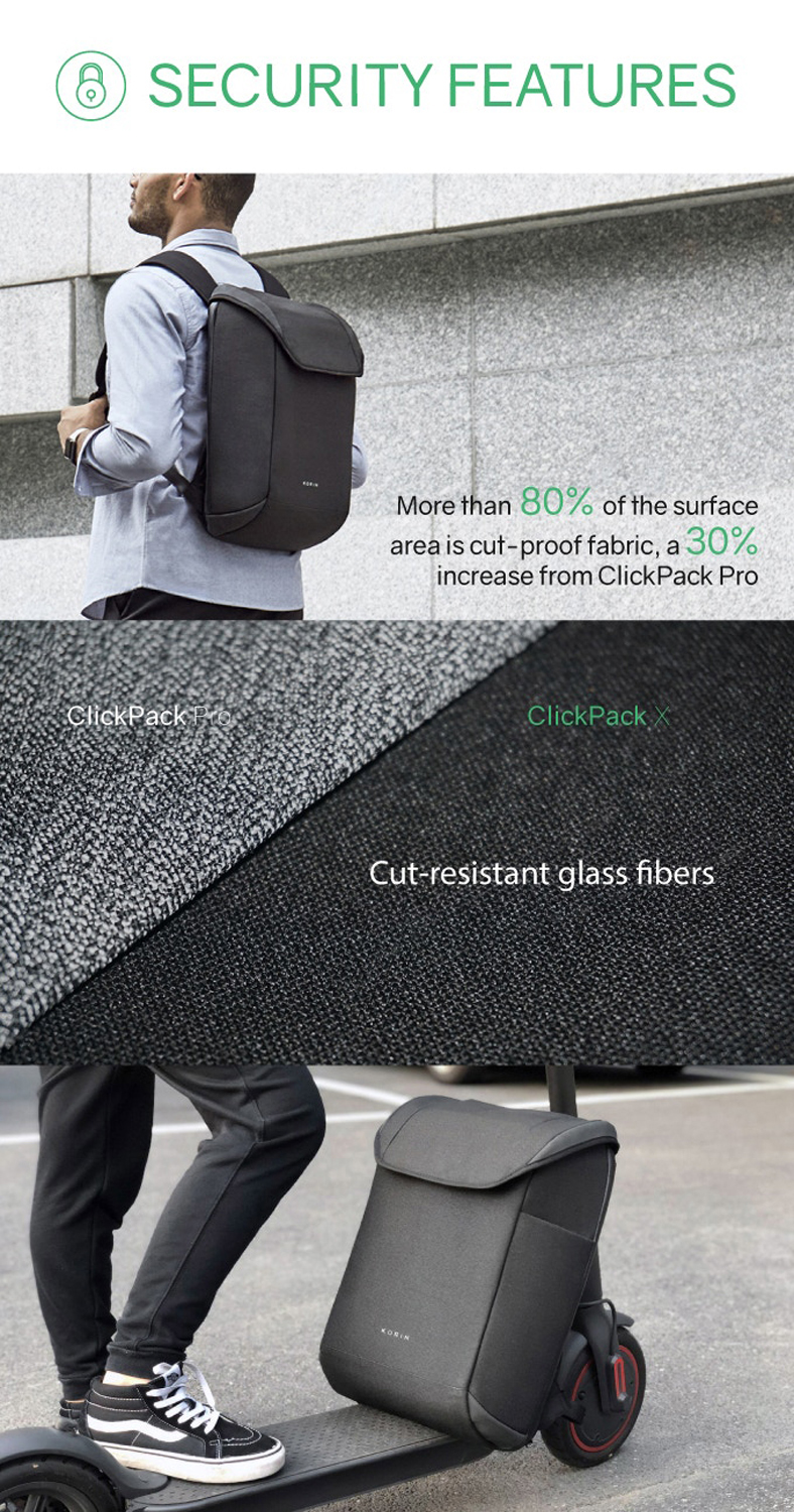 Вместительный городской рюкзак ClickPack X черного цвета, обладатель премии iF Design Award 2020. Размер рюкзака 45х32х15,5 см, объем 18 л, вес 1200 гр. Сделан из свехпрочного устойчивого к порезам и трению водоотталкивающего полиэстера многослойного плетения. Сочетание полиэстера и стекловолокна защищает от порезов ножом или другими острыми предметами. Конструкция достаточно жесткая, не деформируется. Детально продуманная организация отделений позволяет грамотно распределить вес. Самые тяжелые предметы располагаются ближе к спине, например, в отделении размером 34х28х3 см для ноутбука диагональю до 15,6” с дополнительным карманом размером 18х24 см для планшета диагональю до 8” или мелких вещей. Благодаря плотным перегородкам ноутбук надежно фиксируется и не перемещается при ходьбе. Специальная анатомическая конструкция снижает нагрузку на плечи и спину, и вес рюкзака воспринимается на 20-25% легче, чем при использовании стандартных моделей рюкзаков. Вентилируемая спинка с мягкими анатомическими вставками и дополнительной защитой поясничного отдела позвоночника. Конструкция рюкзака позволяет открывать его под углом 30° или распахнуть полностью на 180°. Если необходимо достать какие-то мелочи, достаточно зафиксировать липучки для вертикального открытия на 30°, а для того, чтобы аккуратно уложить в рюкзак много различных предметов, просто положите его и раскройте на 180°. Дополнительно в основном отделении расположены еще 5 карманов различного функционала. 2 кармана размерами 13х22 см и 14х22 см на молниях и 3 открытых кармана под мелочи, в один из которых размером 16х10 см можно поместить powerbank, т к в него приходит USB-кабель, соединенный с портом на внешней стороне рюкзака для легкого подключения к смартфону. Это оригинальная запатентованная система зарядки K EasyCharging 3.0 нового поколения с помощью USB-порта, расположенного в лямке рюкзака, и кабеля, идущего к powerbank, что делает мобильную зарядку более удобной. С внешней стороны рюкзака сбоку есть специальный водозащищенный карман размером 14х11 см. В него можно поместить бутылку с водой или зонт. Рюкзак закрывается на водонепроницаемую молнию YKK, которую можно зафиксировать с помощью кодового замка TSA007 с функцией таможенного досмотра. После этого рюкзак закрывается клапаном, фиксирующимся магнитным замком с системой SNAP. На клапане расположен easy access карман с магнитной застежкой. На правой лямке рюкзака находится USB-порт, на левой - easy access карман для карточек. На обеих лямках с удобной новой системой регулировки и фиксации пряжек есть петельки, за которые можно прицепить очки или проводные наушники. На спинке рюкзака расположен внешний потайной карман на магнитной застежке размером 14х28 см. Над ним есть дополнительная лямка, за которую можно закрепить рюкзак на выдвижной ручке чемодана. В дополнение к вышеперечисленным средствам защиты рюкзак ClickPack X оснащен стальным тросом, которым можно обхватить неподвижный предмет и затем зафиксировать бегунком молнии в кодовом замке. Сверху расположена специальная ручка, за которую при необходимости удобно нести рюкзак в руках. На углах клапана рюкзака размещены треугольные светоотражающие элементы черного цвета, отлично вписывающиеся в основной дизайн. В темное время суток они равномерно отсвечивают практически на 360° и делают вас заметными на расстоянии до 100 метро