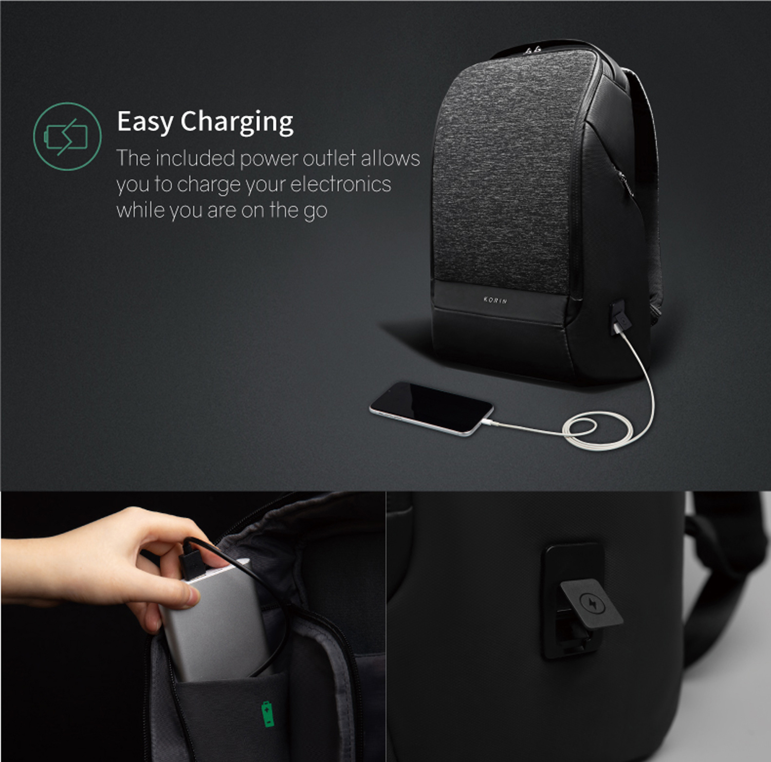 Вместительный водозащищенный рюкзак FlexPack Pro, обладатель премий iF Design Award 2019, Golden Pin Design Award, China Outstanding Industrial Design (CEID) Award, Governor Cup Industrial Design Excellence Award. Сделан из комбинации высокопрочных устойчивого к порезам и трению водоотталкивающих материалов: полиэстера и ткани многослойного плетения разных типов (нейлон, полиэстер и стекловолокно) черного и темно-серого цветов. Не требует специального ухода. Размер рюкзака 47х34х18 см, объем 18 л, вес 1330 гр. Рюкзак закрывается на водонепроницаемую молнию, которую можно зафиксировать с помощью кодового замка TSA007 с функцией таможенного досмотра. Конструкция рюкзака достаточно жесткая, не деформируется. Внутри рюкзака есть специальный карман, в который можно поместить powerbank, т к в него приходит USB-кабель (600 мм, 0,5-0,7 А, 5В), соединенный с портом на внешней стороне рюкзака для легкого подключения к смартфону. Это оригинальная запатентованная система зарядки K EasyCharging 1.0 с помощью USB-порта, расположенного в борту рюкзака, и кабеля, идущего к powerbank, что делает мобильную зарядку более удобной. По бокам рюкзака расположены 2 easy access кармана размером 22х12 см на водонепроницаемых молниях для термокружки, бутылки с водой, зонта, смартфона или других относительно небольших предметов. Детально продуманная организация отделений позволяет грамотно распределить вес. Самые тяжелые предметы располагаются ближе к спине, например, в отделении с мягким покрытием для ноутбука диагональю до 15,6”. Ноутбук надежно фиксируется и не перемещается при ходьбе. Внутри рюкзака есть 5 дополнительных карманов на молниях: 3 кармана 15-17х21-26 см и 2 боковых кармана с отделениями для телефона и мелочей 11,5х20 см. Специальная анатомическая конструкция вентилируемых мягких спинки и лямок и дополнительная поперечная лямка на магнитной застежке снижает нагрузку на плечи и спину, вес рюкзака воспринимается на 20-25% легче, чем при использовании стандартных моделей рюкзаков. На лямке специальная петля для очков или наушников. Сверху рюкзака есть удобная ручка из высококачественной прочной резины, за которую его можно нести или зафиксировать на ручке чемодана. Рюкзак оснащен стальным тросом, которым можно обхватить неподвижный предмет и затем зафиксировать в кодовом замке.