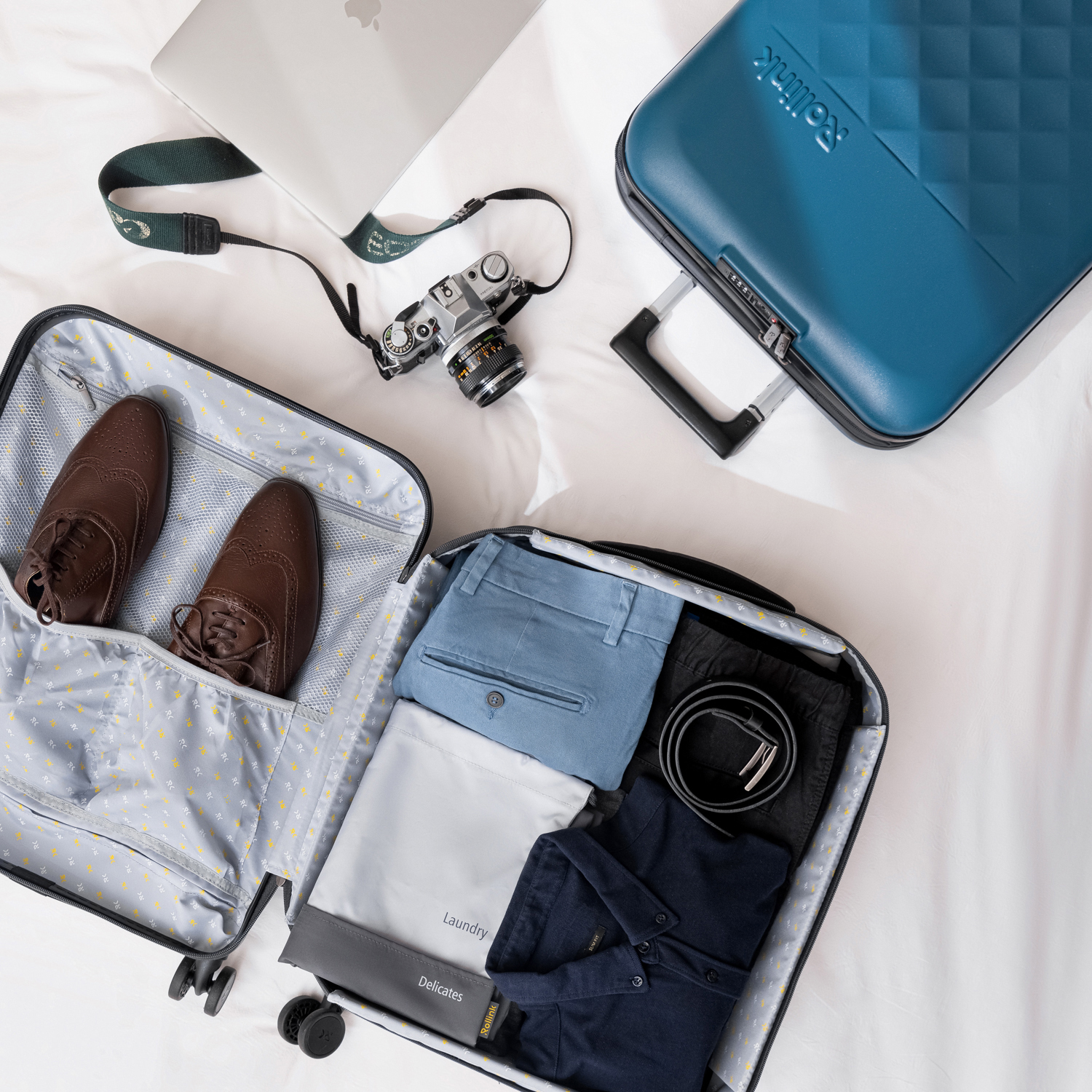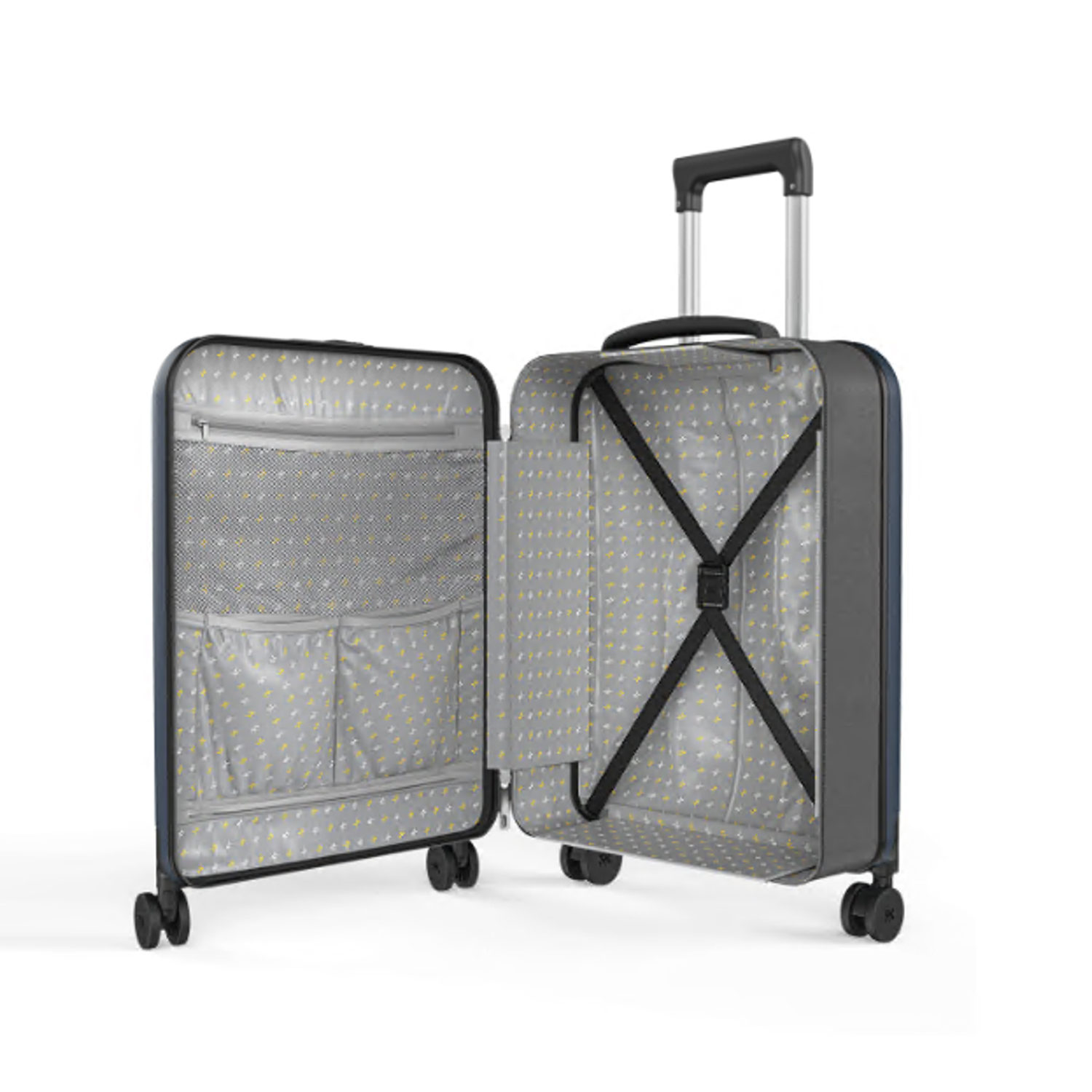 Складной легкий чемодан Rollink Vega 360 серо-синего цвета Atlantic Blue. Размер 55х40х20 см. В сложенном виде толщина составляет 11 см. Объем 39 л. Вес 2,8 кг. Жесткие стенки сделаны из поликарбоната повышенной ударопрочности. Бока мягкие, из темно-серого плотного нейлона с высокой водоотталкивающей способностью. Внутри четыре откидывающихся жестких клапана, крепятся липучками и сохраняют форму чемодана в собранном виде. Внутри чемодана эластичная Х-образная стяжка для фиксации предметов, сетчатый карман 20х35 см на молнии и два открытых кармана 17х19 см на резинках. Бегунки молнии фиксируются с помощью кодового замка TSA с функцией таможенного досмотра. Боковой easy access карман 9,5х18,5 см на липучке для документов и телефона. Удлиненная надежная выдвижная телескопическая ручка из алюминия с несколькими уровнями фиксации высоты ручки (от пола 80/86/96/104 см) для людей разного роста и удобная мягкая ручка сверху чемодана, чтобы было удобно нести его в руках. 4 сдвоенных колеса с вращением на 360 градусов и со специальным покрытием и подшипниками для более плавного и бесшумного передвижения. Высококачественная молния черного цвета. В комплект входит регулируемая стяжка для фиксации чемодана в сложенном состоянии. Чемодан упакован в белый нетканный чехол с ручками на молнии и в индивидуальную картонную коробку 56,5х42,5х13,5 см с ручкой.