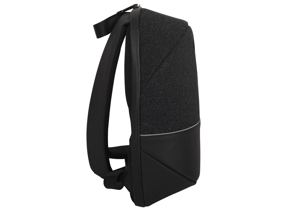 Рюкзак выполнен из прочного полиэстера чистого черного цвета и черного с мелкими белыми вкраплениями. Граница между ними обозначена белой линией, что вносит определенный акцент и разбавляет строгость дизайна. Рюкзак имеет ручку для переноски и два широких утолщенных плечевых ремня, которые регулируются по длине. Спинка рюкзака ортопедическая, что делает процесс его ношения максимально комфортным и безопасным для здоровья.