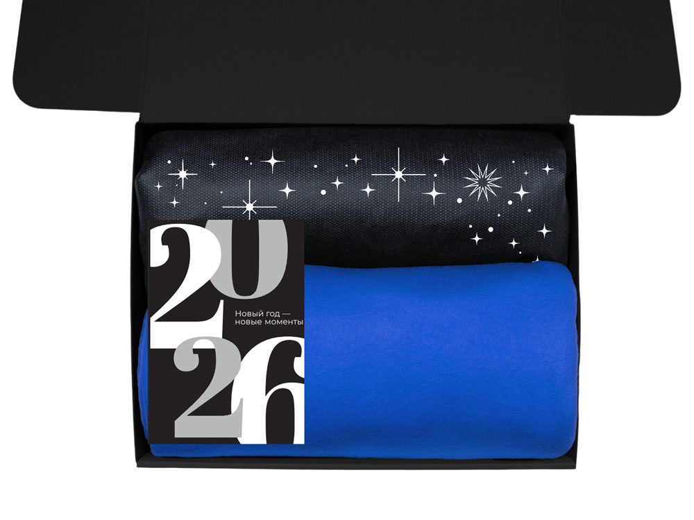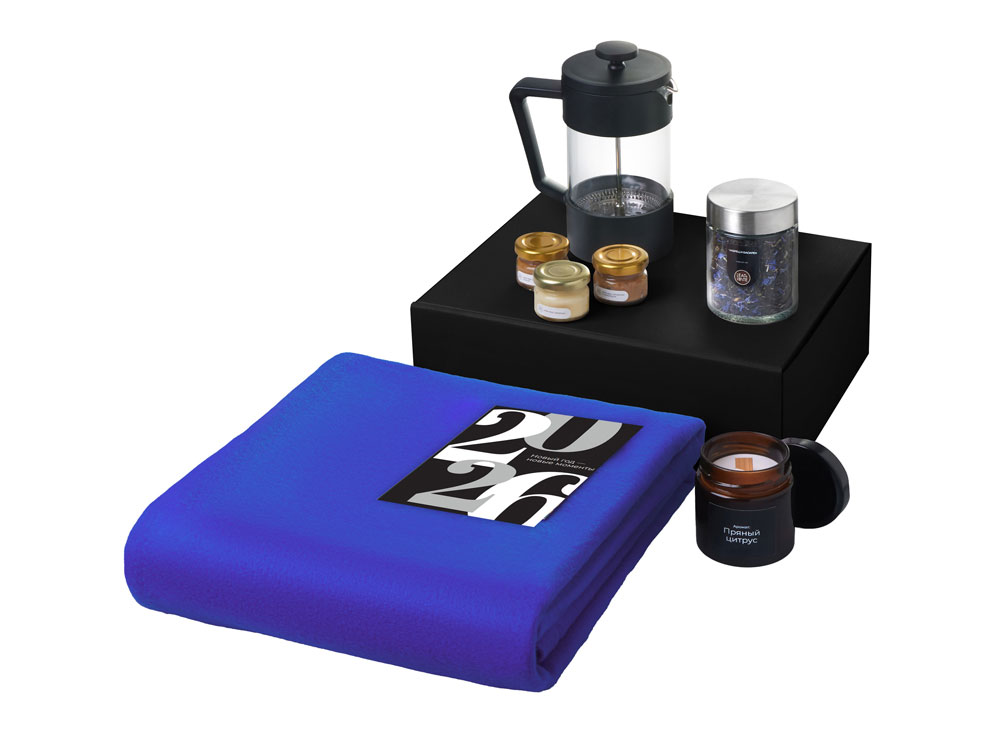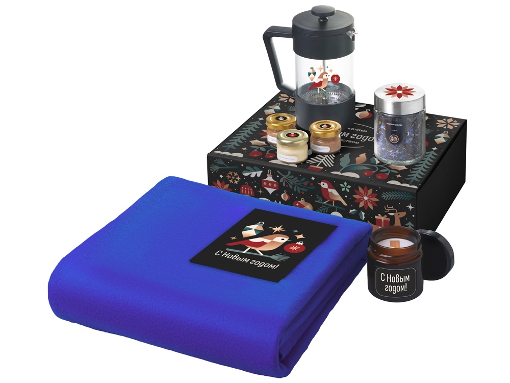Подарочный набор c пледом, френчпрессом, чаем и медом, синий