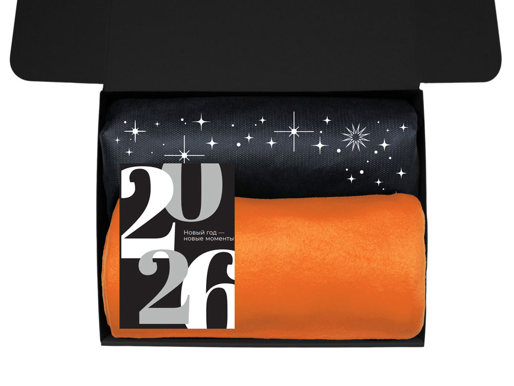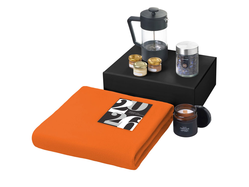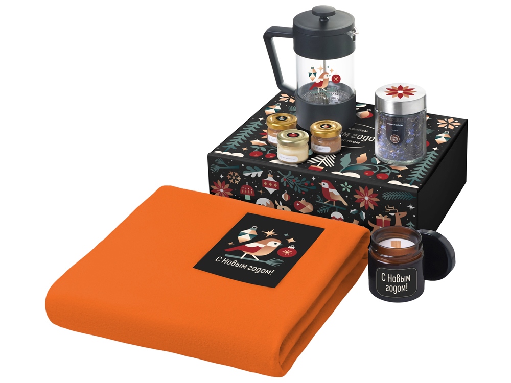 Подарочный набор c пледом, френчпрессом, чаем и медом, оранжевый