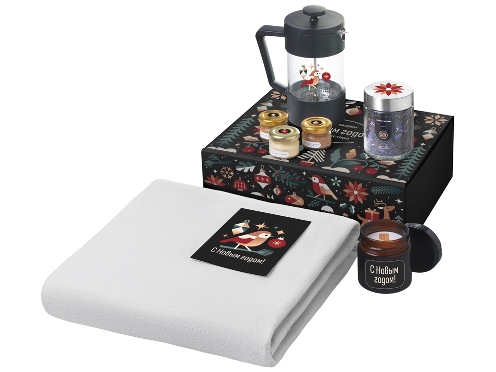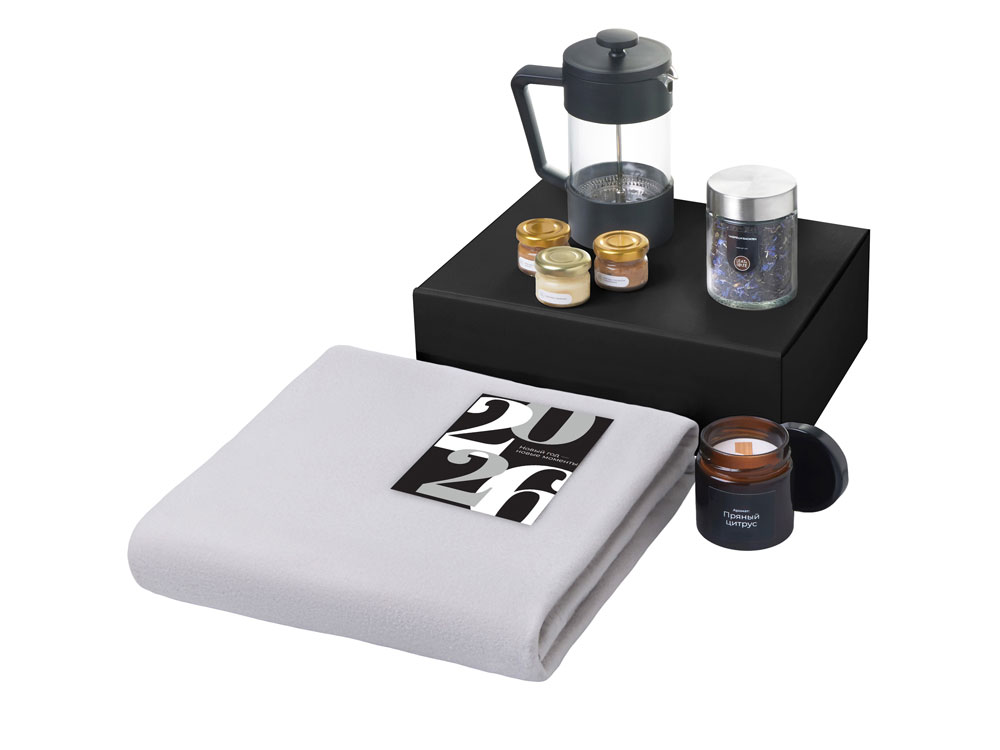 Подарочный набор c пледом, френчпрессом, чаем и медом, серый