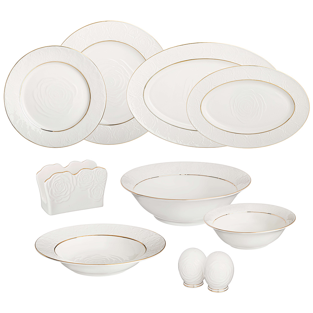 тарелка глубокая, д=23 см. - 6шт., тарелка десертная 21 см. - 6шт., подстановочная тарелка 26 см. - 6шт., салфетница 7*11 см.- 1шт., салатник 16 см. - 2шт, салатник 23 см. -1 шт., блюдо овальное - 35,5*23 - 1шт., блюдо овальное - 26,8*18 набор для специий 2 пр.высота=7 см.