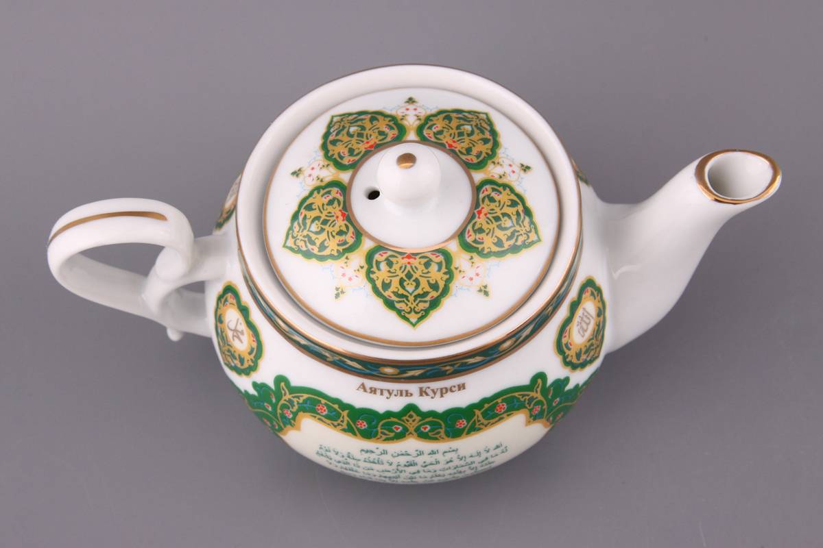 ТМ LEFARD представляет эксклюзивную коллекцию посуды «Суры из Корана». Кувшины, чайники, сахарницы, кружки, чайные пары, декоративные тарелки и другие предметы выполнены из высококачественного тонкостенного фарфора. Восточный орнамент, небольшие отрывки Сур из Корана на классическом арабском и русском языках с отделкой золотом украшают изделия. Это прекрасный мусульманский подарок, всегда нужный и теплый. Относитесь к нему бережно и с почтением. Посуду коллекции можно использовать как в повседневной жизни, так и на торжественном приеме. Не рекомендуется мыть в посудомоечной машине и использовать в микроволновой печи.