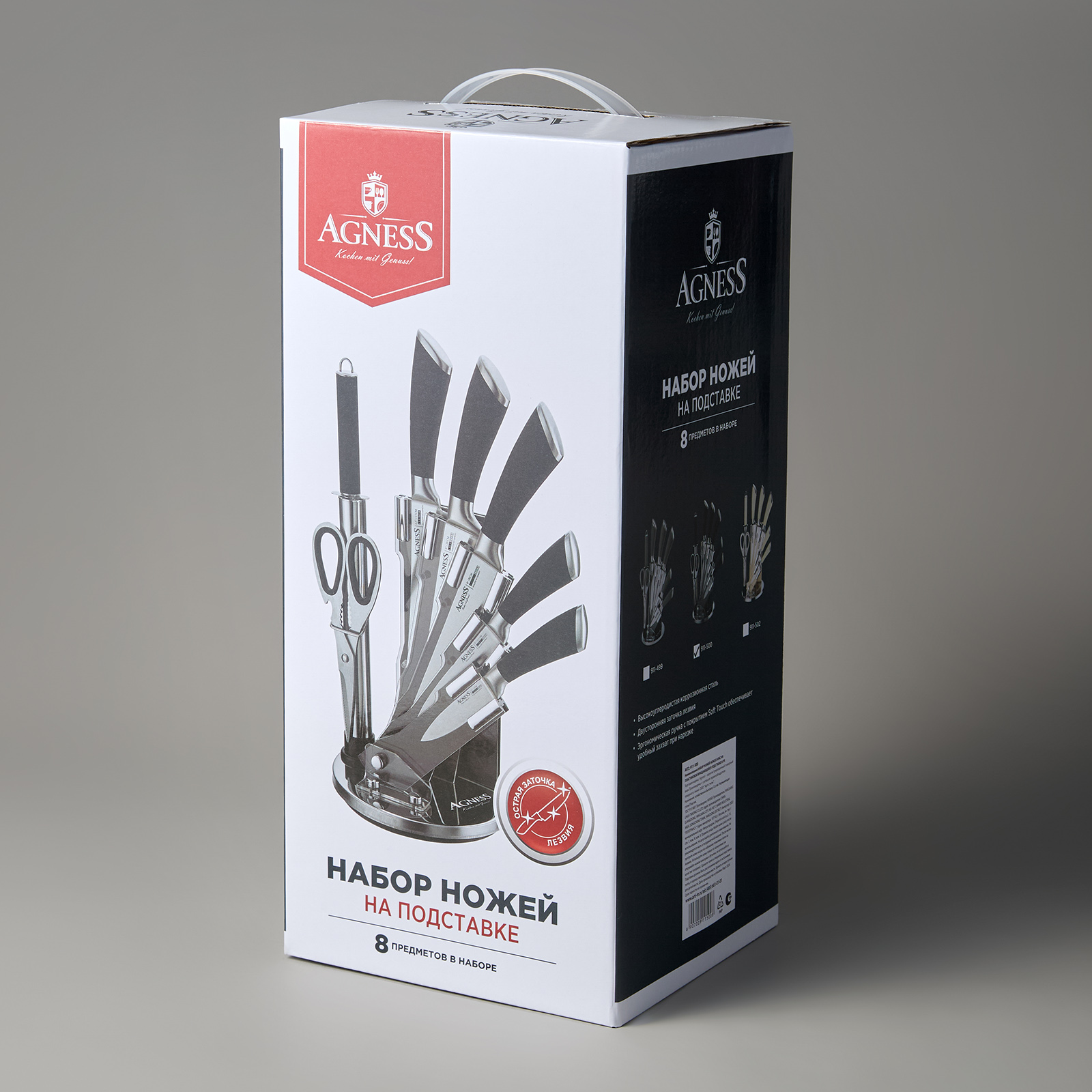 НАБОР НОЖЕЙ AGNESS НЖС НА ПЛАСТИКОВОЙ ВРАЩАЮЩЕЙСЯ ПОДСТАВКЕ 8 ПР. (КОР=6НАБОР.)