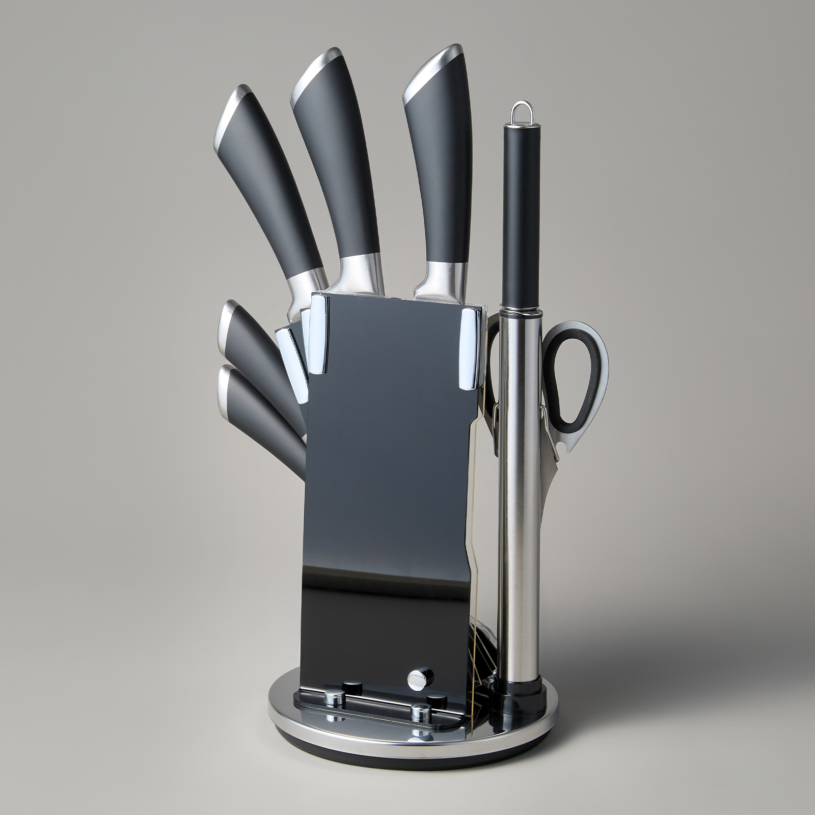 ● Состав набора: Топорик 17см, Нож поварской 20см, Нож для нарезки 20см, Нож универсальный 12,5см, Нож для чистки овощей и фруктов, 9см, Мусат, Ножницы для птицы, Складывающаяся подставка.