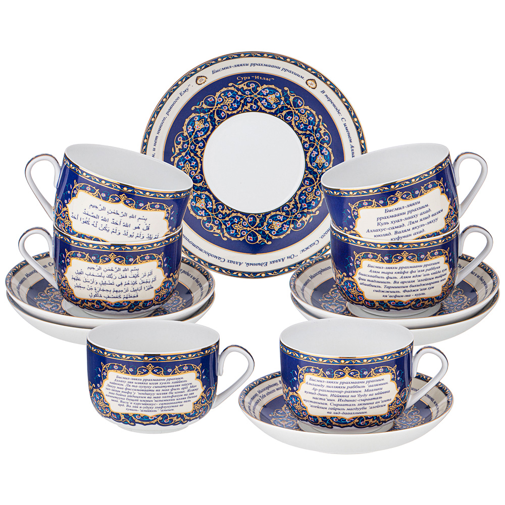 ТМ LEFARD представляет эксклюзивную коллекцию посуды «Суры из Корана». Кувшины, чайники, сахарницы, кружки, чайные пары, декоративные тарелки и другие предметы выполнены из высококачественного тонкостенного фарфора. Восточный орнамент, небольшие отрывки Сур из Корана на классическом арабском и русском языках с отделкой золотом украшают изделия. Это прекрасный мусульманский подарок, всегда нужный и теплый. Относитесь к нему бережно и с почтением. Посуду коллекции можно использовать как в повседневной жизни, так и на торжественном приеме. Не рекомендуется мыть в посудомоечной машине и использовать в микроволновой печи.