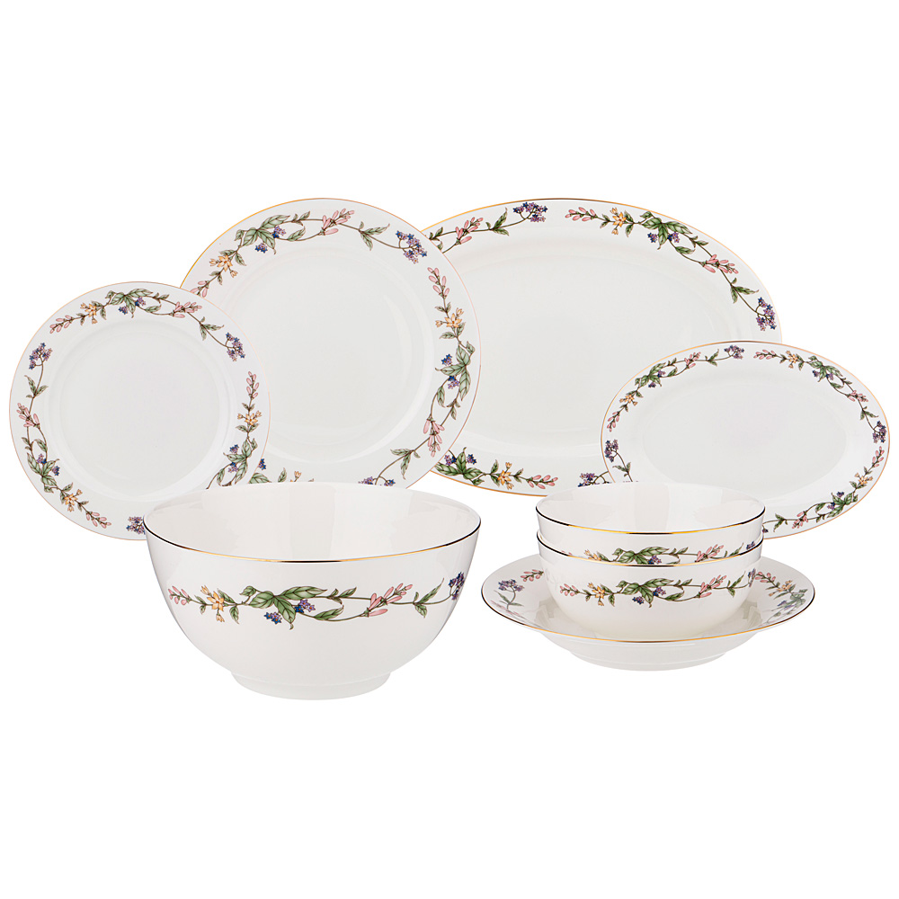 Комплектность: тарелка обеденная 25,5 см 6 шт., тарелка закусочная 20,5 см 6 шт., тарелка суповая 23 см 6 шт., салатник 23 см 1750 мл, салатник 16 см 750 мл 2 шт., блюдо овальное 36 см. блюдо овальное 23 см.