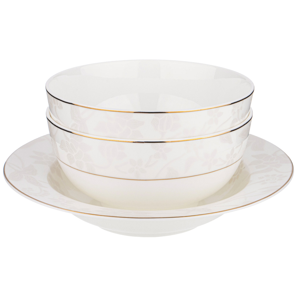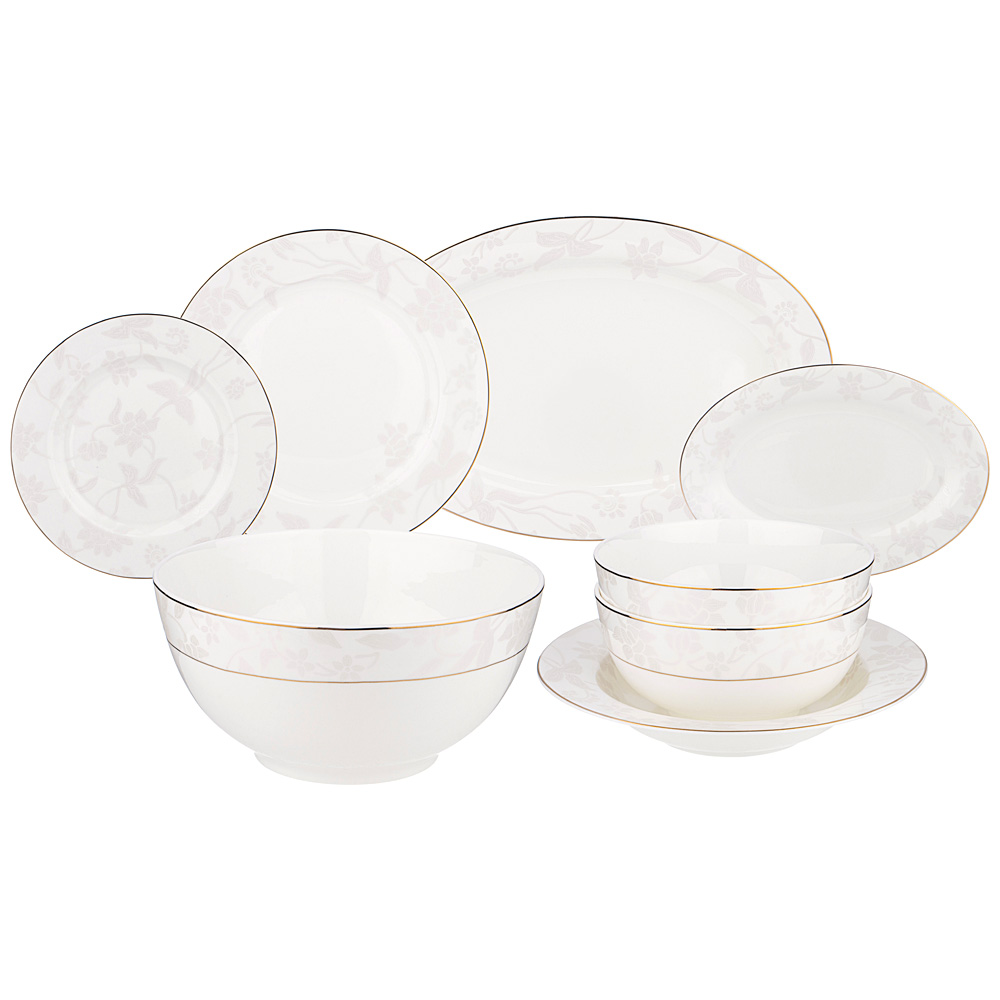 Комплектность: тарелка обеденная 25,5 см 6 шт., тарелка закусочная 20,5 см 6 шт., тарелка суповая 23 см 6 шт., салатник 23 см 1750 мл, салатник 16 см 750 мл 2 шт., блюдо овальное 36 см, блюдо овальное 23 см.