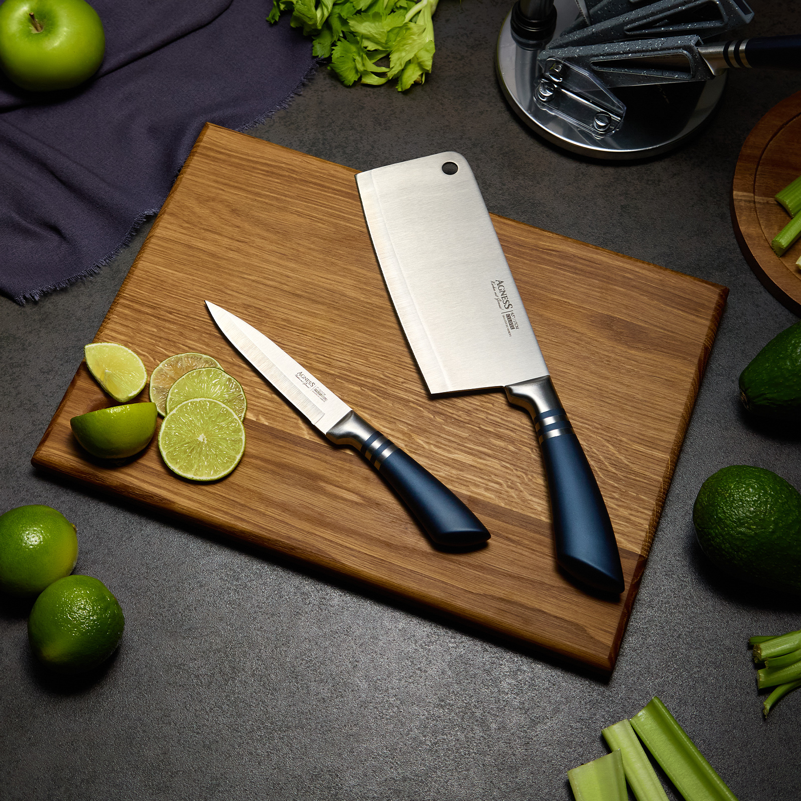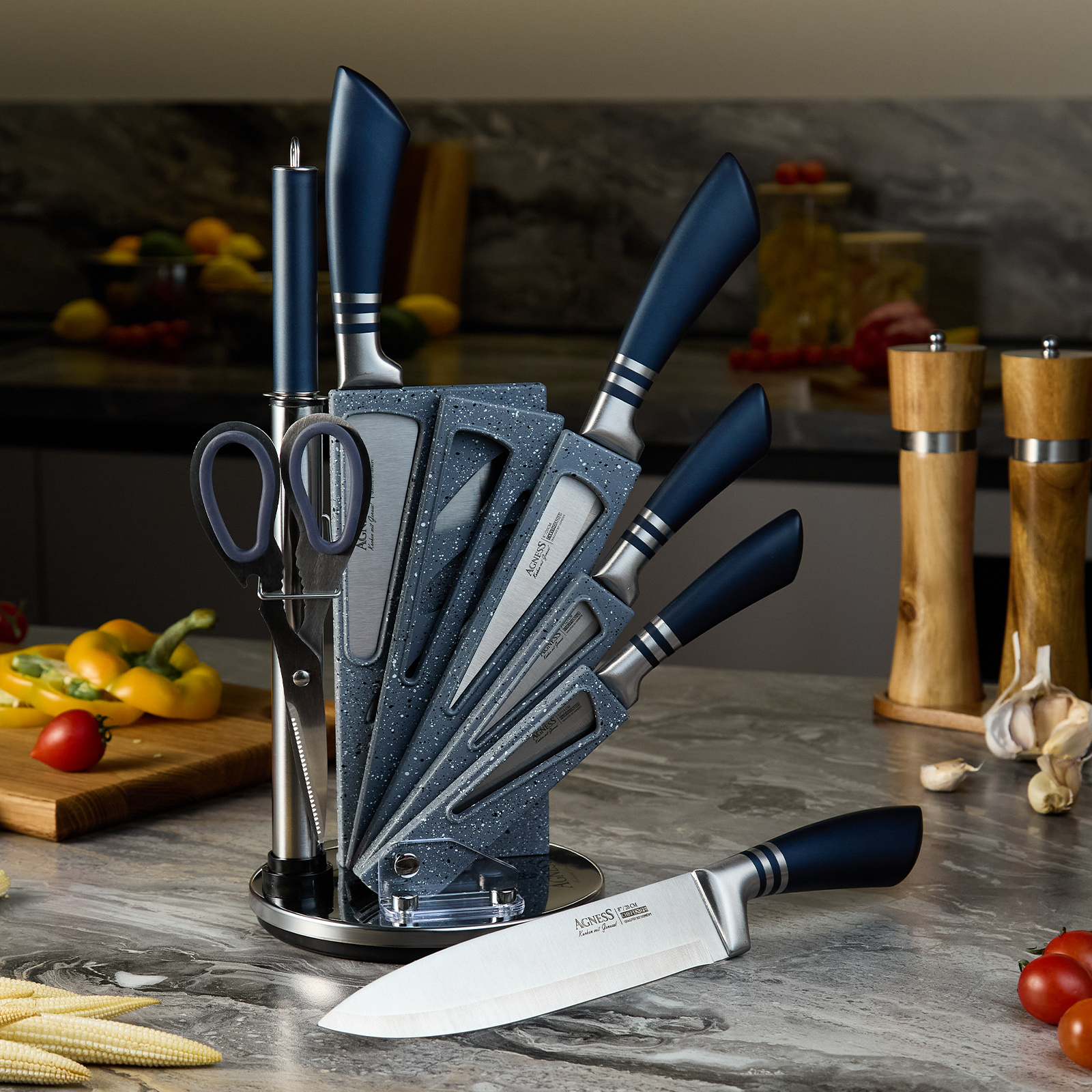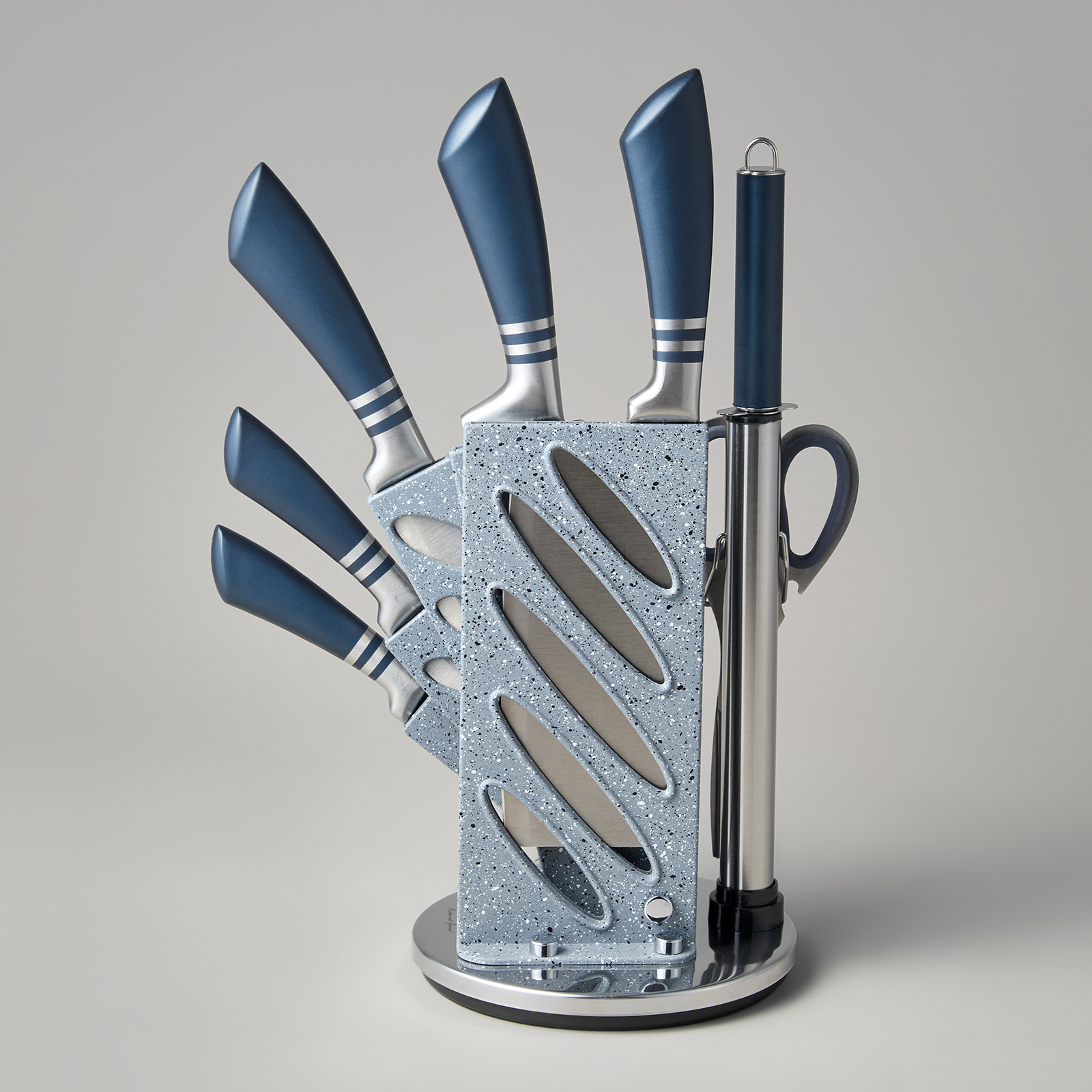 ● Состав набора: Топорик 17см, Нож поварской 20см, Нож для нарезки 20см, Нож универсальный 12,5см, Нож для чистки овощей и фруктов, 9см, Муссат, Ножницы, Складывающаяся вращающаяся пластиковая подставка для безопасного хранения ножей.