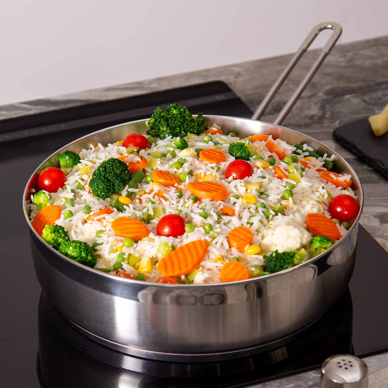 Корпус сковороды выполнен из ВЫСОКОКАЧЕСТВЕННОЙ НЕРЖАВЕЮЩЕЙ ХРОМНИКЕЛЕВОЙ СТАЛИ 18/10.