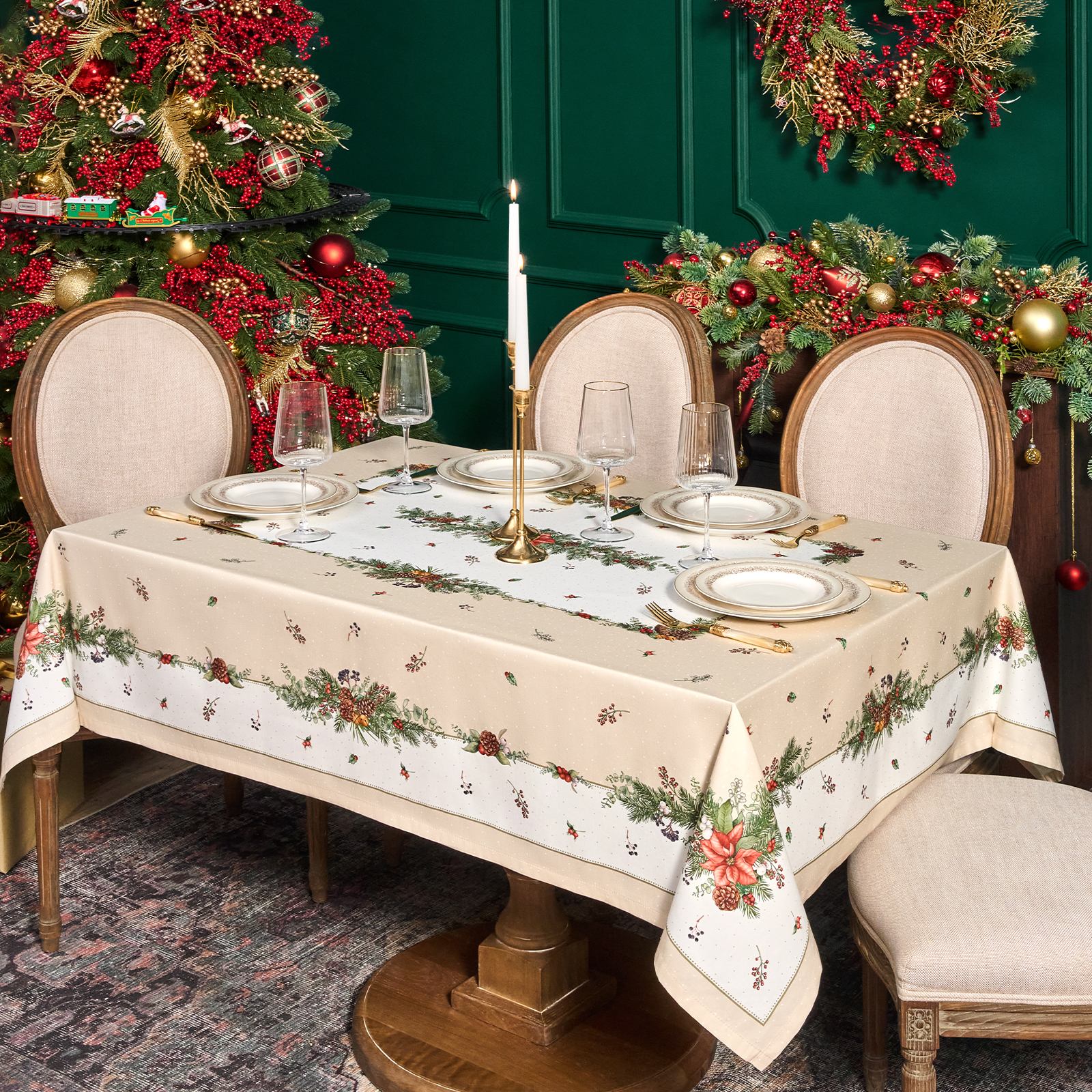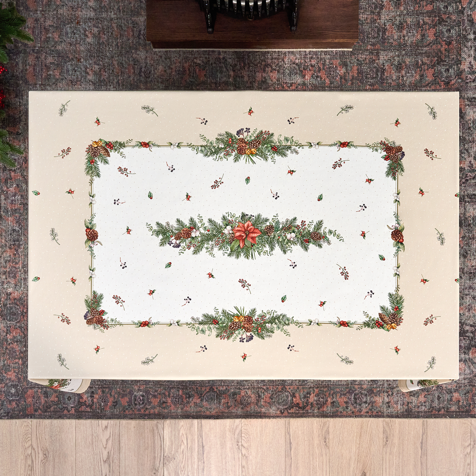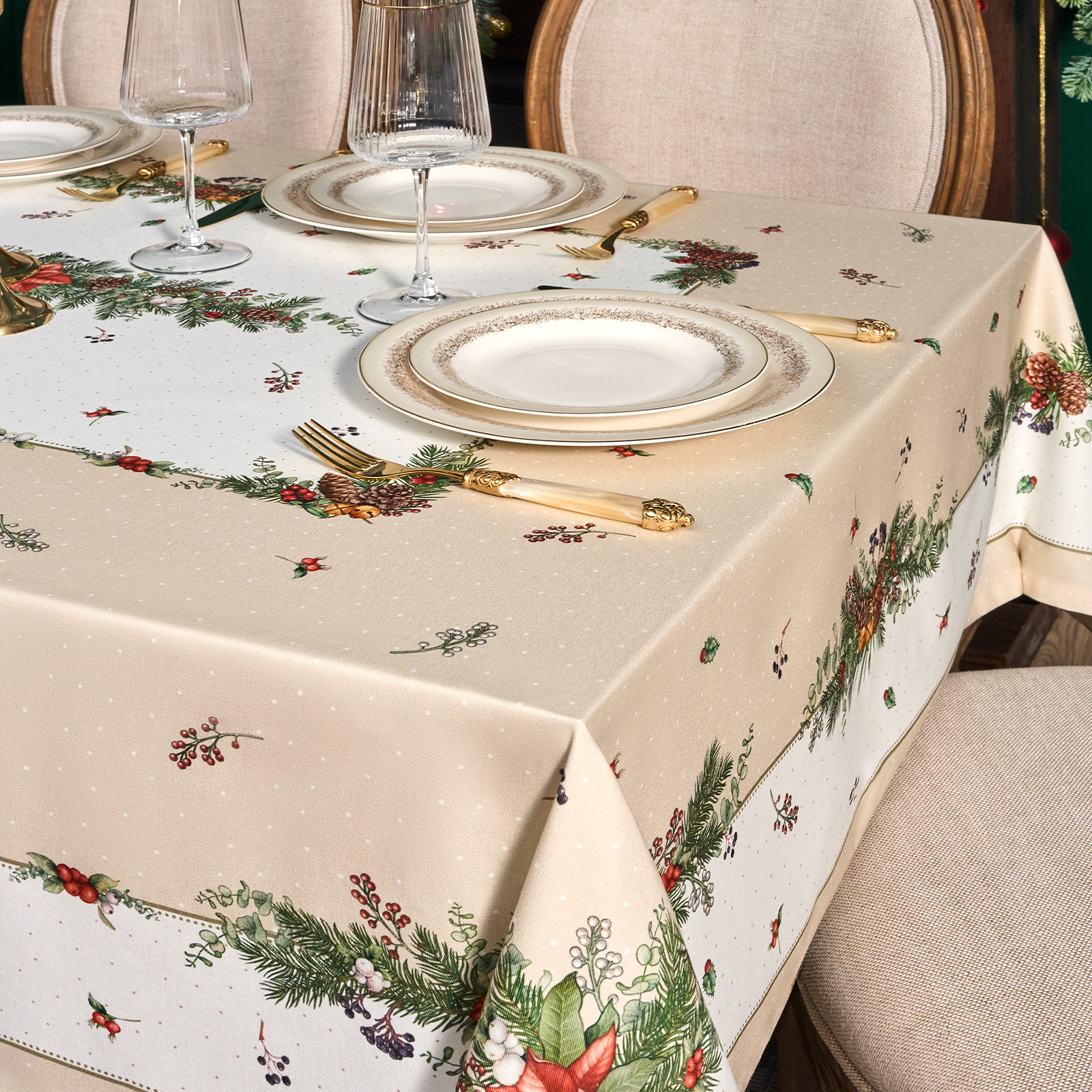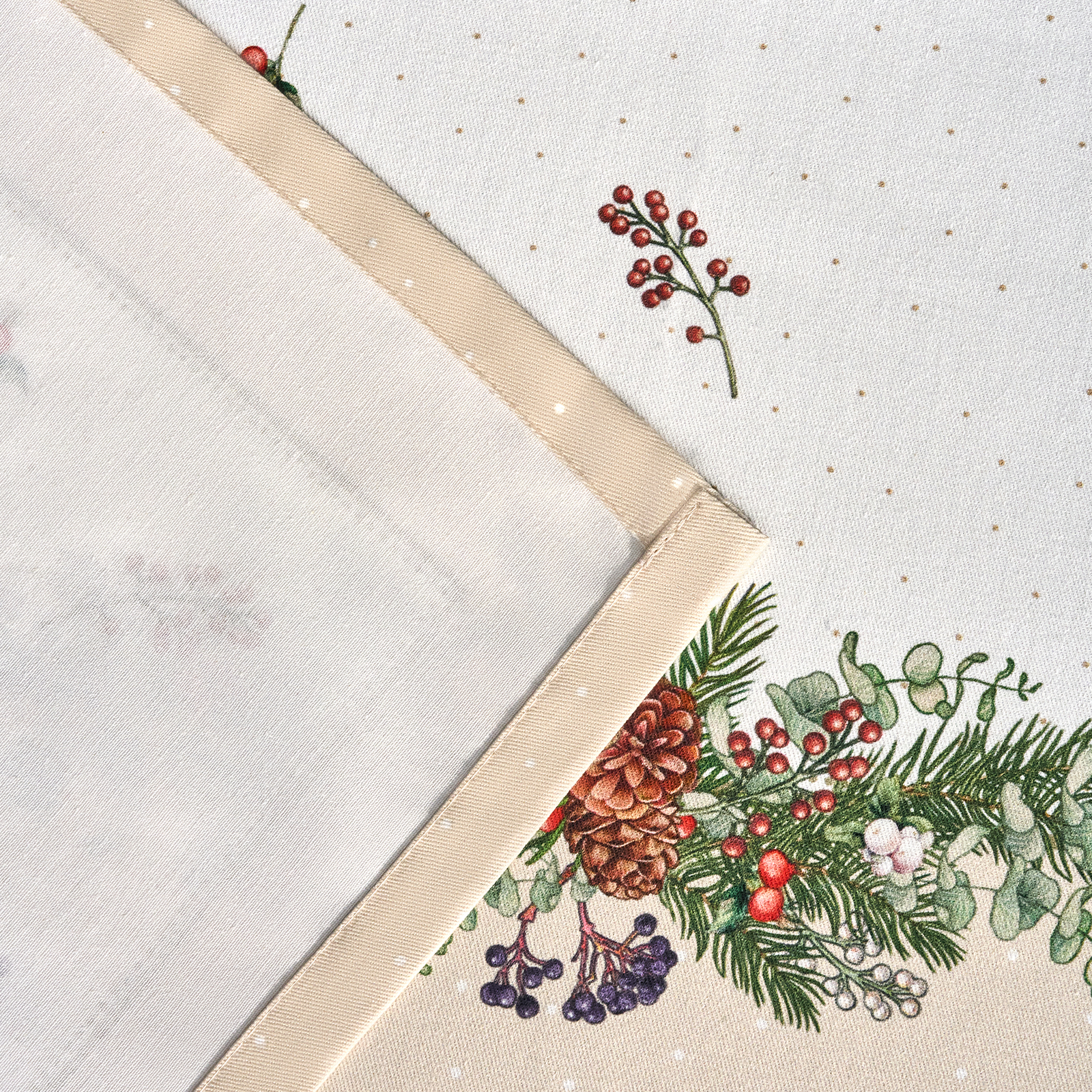 Скатерть выполнена из высококачественного 100% хлопка с саржевым переплетением Твил. Эта ткань не заламывается и не мнется. Скатерть из твила выглядит аккуратно и элегантно и имеет плотность 190 г\м2. Такая плотность ткани позволяет стирать скатерть, гладить и сушить более 100 раз без потери качества. Скатерть имеет дополнительную водоотталкивающую пропитку, которая защитит её от разлитой жидкости. Цифровая печать принта выполнена по всем сторонам скатерти и с любой стороны будет выглядеть красиво и четко, каждый штрих детально прорисован во всём многообразии оттенков. Коллекция Celebration имеет универсальный красивый зимний дизайн с шишками, веточками ели и пуансеттией. Она подойдет как для празднования Нового года, Рождества, так и для повседневного использования и декора, а специальная пропитка избавит вас от хлопот с отстированием пятен после застолья. Размер скатерти 140*180 см отлично подойдет для прямоугольных столов размером 100*120 см.