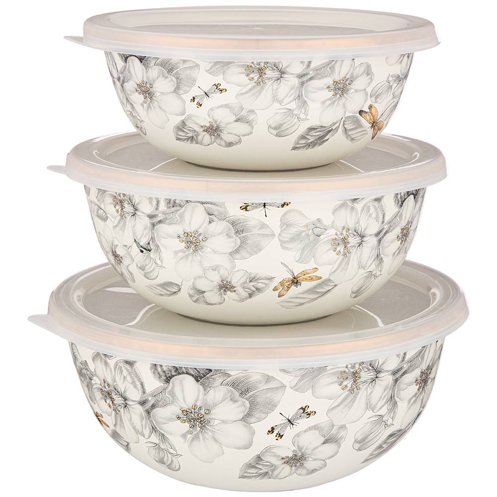 НАБОР МИСОК AGNESS ЭМАЛИРОВАН. С ПЛАСТИК.КРЫШКАМИ, СЕРИЯ ЯБЛОНЕВЫЙ САД, 6ПР.14/16/18СМ, 0,6/0,9/1,3Л