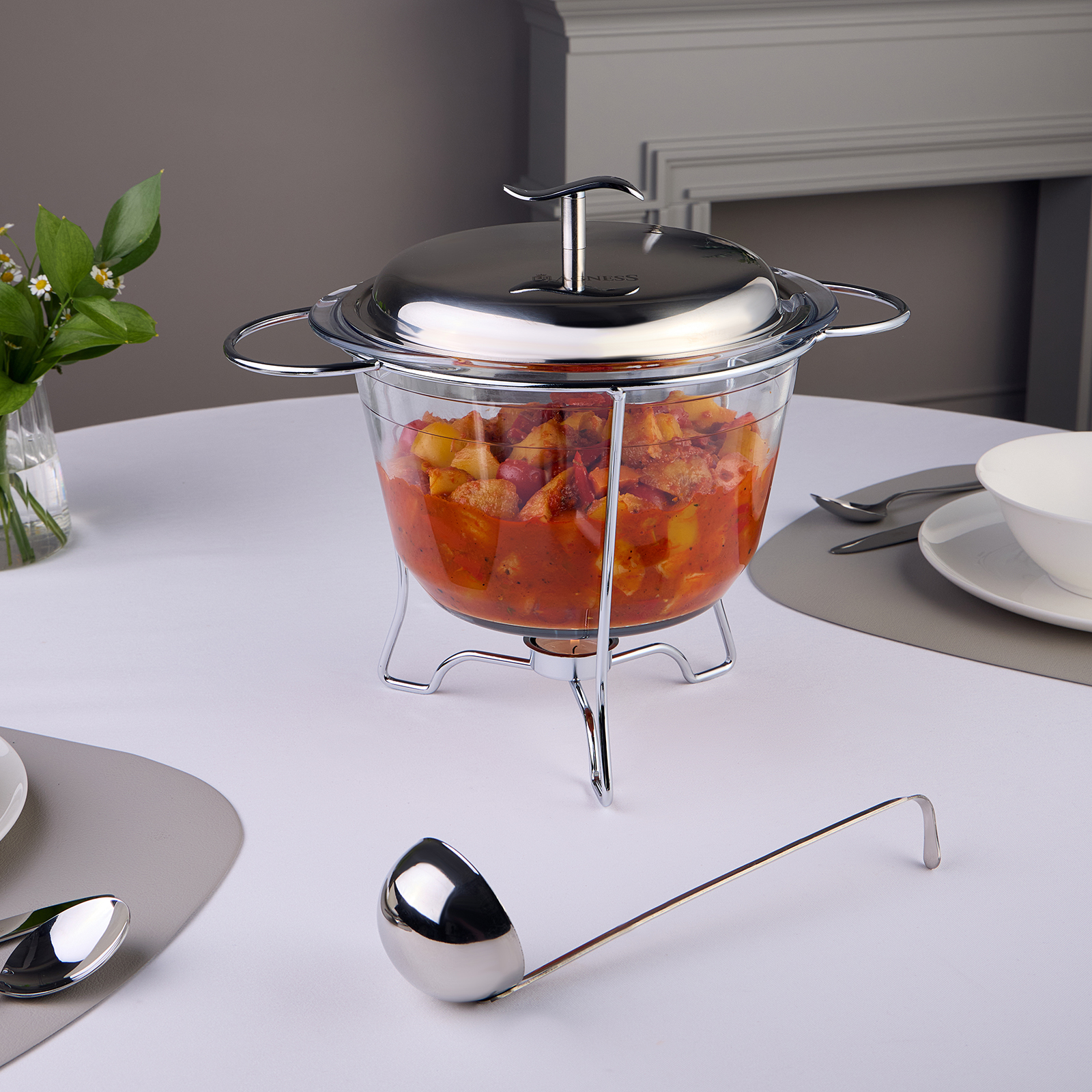 Стеклянную жаропрочную емкость можно использовать для запекания в духовом шкафу (максимальная температура нагрева до 400 С). Стеклянную емкость и крышку можно мыть в посудомоечнйо машине, хромированная подставка не подходит для мытья в посудомоечной машине.